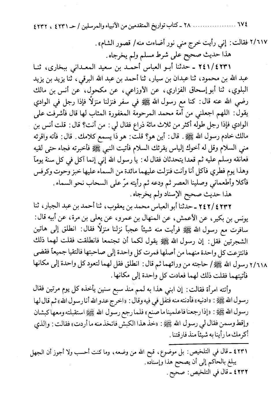 4231 - حَدَّثَنَا أَبُو الْعَبَّاسِ أَحْمَدُ بْنُ سَعِيدٍ الْمَعْدَانِيُّ بِبُخَارَى، ثنا عَبْدُ اللَّهِ بْنُ مَحْمُودٍ، ثنا عَبْدَانُ بْنُ سَيَّارٍ، ثنا أَحْمَدُ بْنُ عَبْدِ اللَّهِ الْبَرْقِيُّ، ثنا يَزِيدُ بْنُ يَزِيدَ الْبَلَوِيُّ، ثنا أَبُو إِسْحَاقَ الْفَزَارِيُّ، عَنِ الْأَوْزَاعِيِّ، عَنْ مَكْحُولٍ، عَنْ أَنَسِ بْنِ مَالِكٍ رَضِيَ اللَّهُ عَنْهُ، قَالَ: " كُنَّا مَعَ رَسُولِ اللَّهِ صَلَّى اللهُ عَلَيْهِ وَسَلَّمَ فِي سَفَرٍ فَنَزَلْنَا مَنْزِلًا فَإِذَا رَجُلٌ فِي الْوَادِي يَقُولُ: §اللَّهُمَّ اجْعَلْنِي مِنْ أُمَّةِ مُحَمَّدٍ الْمَرْحُومَةِ الْمَغْفُورَةِ، الْمُثَابِ لَهَا قَالَ: فَأَشْرَفْتُ عَلَى الْوَادِي فَإِذَا رَجُلٌ طُولُهُ أَكْثَرُ مِنْ ثَلَاثِ مِائَةِ ذِرَاعٍ، فَقَالَ لِي: مَنْ أَنْتَ؟ قَالَ: قُلْتُ: أَنَسُ بْنُ مَالِكٍ خَادِمُ رَسُولِ اللَّهِ صَلَّى اللهُ عَلَيْهِ وَسَلَّمَ، قَالَ: أَيْنَ هُوَ؟ قُلْتُ: هُوَ ذَا يَسْمَعُ كَلَامَكَ، قَالَ: فَأْتِهِ وَأَقْرِئْهُ مِنِّي السَّلَامَ وَقُلْ لَهُ: أَخُوكَ إِلْيَاسُ يُقْرِئُكَ السَّلَامَ، فَأَتَيْتُ النَّبِيَّ صَلَّى اللهُ عَلَيْهِ وَسَلَّمَ فَأَخْبَرْتُهُ فَجَاءَ حَتَّى لَقِيَهُ فَعَانَقَهُ وَسَلَّمَ عَلَيْهِ، ثُمَّ قَعَدَا يَتَحَدَّثَانِ فَقَالَ لَهُ: يَا رَسُولَ اللَّهِ، إِنِّي إِنَّمَا آكُلُ فِي كُلِّ سَنَةٍ يَوْمًا، وَهَذَا يَوْمُ فِطْرِي، فَآكُلُ أَنَا وَأَنْتَ فَنَزَلَتْ عَلَيْهِمَا مَائِدَةٌ مِنَ السَّمَاءِ عَلَيْهَا خُبْزٌ وَحُوتٌ وَكَرَفْسٌ، فَأَكَلَا وَأَطْعَمَانِي وَصَلَّيْنَا الْعَصْرَ ثُمَّ وَدَّعَهُ ثُمَّ رَأَيْتُهُ مَرَّ عَلَى السَّحَابِ نَحْوَ السَّمَاءِ «هَذَا حَدِيثٌ صَحِيحُ الْإِسْنَادِ وَلَمْ يُخَرِّجَاهُ» K4231 - بل موضوع قبح الله من وضعه