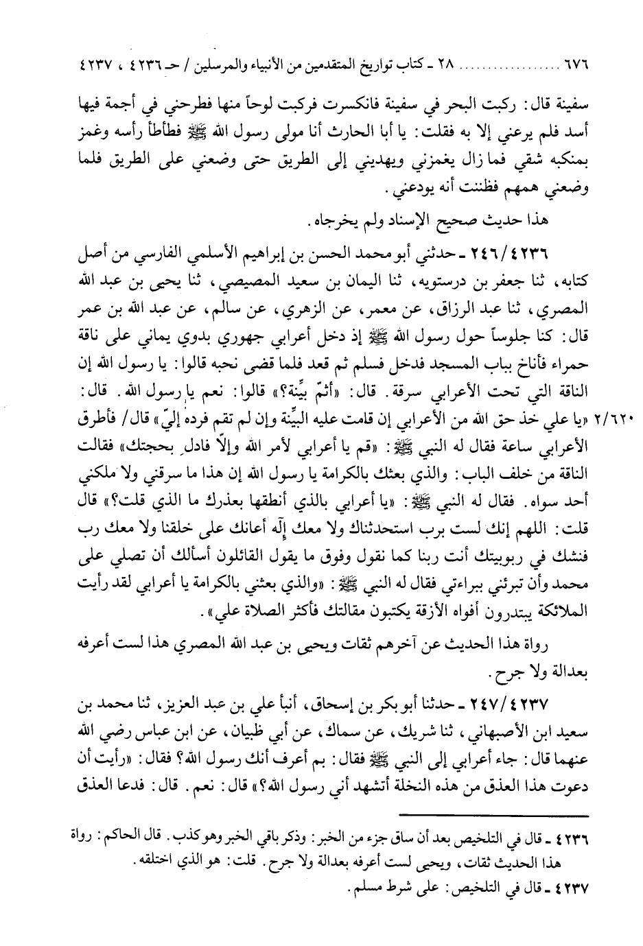4236 - حَدَّثَنِي أَبُو مُحَمَّدٍ الْحَسَنُ بْنُ إِبْرَاهِيمَ الْأَسْلَمِيُّ الْفَارِسِيُّ مِنْ أَصْلِ كِتَابِهِ، ثنا جَعْفَرُ بْنُ دَرَسْتَوَيْهِ، ثنا الْيَمَانُ بْنُ سَعِيدٍ الْمِصِّيصِيُّ، ثنا يَحْيَى بْنُ عَبْدِ اللَّهِ الْمِصْرِيُّ، ثنا عَبْدُ الرَّزَّاقِ، عَنْ مَعْمَرٍ، عَنِ الزُّهْرِيِّ، عَنْ سَالِمٍ، عَنْ عَبْدِ اللَّهِ بْنِ عُمَرَ، قَالَ: كُنَّا جُلُوسًا حَوْلَ رَسُولِ اللَّهِ صَلَّى اللهُ عَلَيْهِ وَسَلَّمَ إِذْ دَخَلَ أَعْرَابِيٌّ جَهْوَرِيٌّ بَدَوِيٌّ يَمَانِيٌّ، عَلَى نَاقَةٍ حَمْرَاءَ فَأَنَاخَ بِبَابِ الْمَسْجِدِ، فَدَخَلَ فَسَلَّمَ ثُمَّ قَعَدَ فَلَمَّا قَضَى نَحْبَهُ، قَالُوا: يَا رَسُولَ اللَّهِ، إِنَّ النَّاقَةَ الَّتِي تَحْتَ الْأَعْرَابِيِّ سَرِقَةٌ، قَالَ: «أَثَمَّ بَيِّنَةٌ؟» قَالُوا: نَعَمْ يَا رَسُولَ اللَّهِ، قَالَ: «يَا عَلِيُّ خُذْ حَقَّ اللَّهِ مِنَ الْأَعْرَابِيِّ إِنْ قَامَتْ عَلَيْهِ الْبَيِّنَةُ وَإِنْ لَمْ تَقُمْ فَرُدَّهُ إِلَيَّ» قَالَ: فَأَطْرَقَ الْأَعْرَابِيُّ سَاعَةً فَقَالَ لَهُ النَّبِيُّ صَلَّى اللهُ عَلَيْهِ وَسَلَّمَ: «قُمْ يَا أَعْرَابِيُّ لِأَمْرِ اللَّهِ وَإِلَّا فَادْلُ بِحُجَّتِكَ» فَقَالَتِ النَّاقَةُ مِنْ خَلْفِ الْبَابِ: وَالَّذِي بَعَثَكَ بِالْكَرَامَةِ يَا رَسُولَ اللَّهِ، إِنَّ هَذَا مَا سَرَقَنِي وَلَا مَلَكَنِي أَحَدٌ سِوَاهُ، فَقَالَ لَهُ النَّبِيُّ صَلَّى اللهُ عَلَيْهِ وَسَلَّمَ: «يَا أَعْرَابِيُّ بِالَّذِي أَنْطَقَهَا بِعُذْرِكَ مَا الَّذِي قُلْتِ؟» قَالَ: قُلْتُ: §اللَّهُمَّ إِنَّكَ لَسْتَ بِرَبٍّ اسْتَحْدَثْنَاكَ وَلَا مَعَكَ إِلَهٌ أَعَانَكَ عَلَى خَلْقِنَا وَلَا مَعَكَ رَبٌّ فَنَشُكُّ فِي رُبُوبِيَّتِكَ أَنْتَ رَبُّنَا كَمَا نَقُولُ وَفَوْقَ مَا يَقُولُ الْقَائِلُونَ أَسْأَلُكَ أَنْ تُصَلِّيَ عَلَى مُحَمَّدٍ وَأَنْ تُبَرِّئَنِي بِبَرَاءَتِي، فَقَالَ لَهُ النَّبِيُّ صَلَّى اللهُ عَلَيْهِ وَسَلَّمَ: «وَالَّذِي بَعَثَنِي بِالْكَرَامَةِ يَا أَعْرَابِيُّ لَقَدْ رَأَيْتُ الْمَلَائِكَةَ يَبْتَدِرُونَ أَفْوَاهَ الْأَزِقَّةِ يَكْتُبُونَ مَقَالَتَكَ فَأَكْثِرِ الصَّلَاةَ عَلَيَّ» رُوَاةُ هَذَا الْحَدِيثِ عَنْ آخِرِهِمْ ثِقَاتٌ وَيَحْيَى بْنُ عَبْدِ اللَّهِ الْمِصْرِيُّ هَذَا لَسْتُ أَعْرِفُهُ بِعَدَالَةٍ، وَلَا جَرْحٍ "K4236 - هو كذب