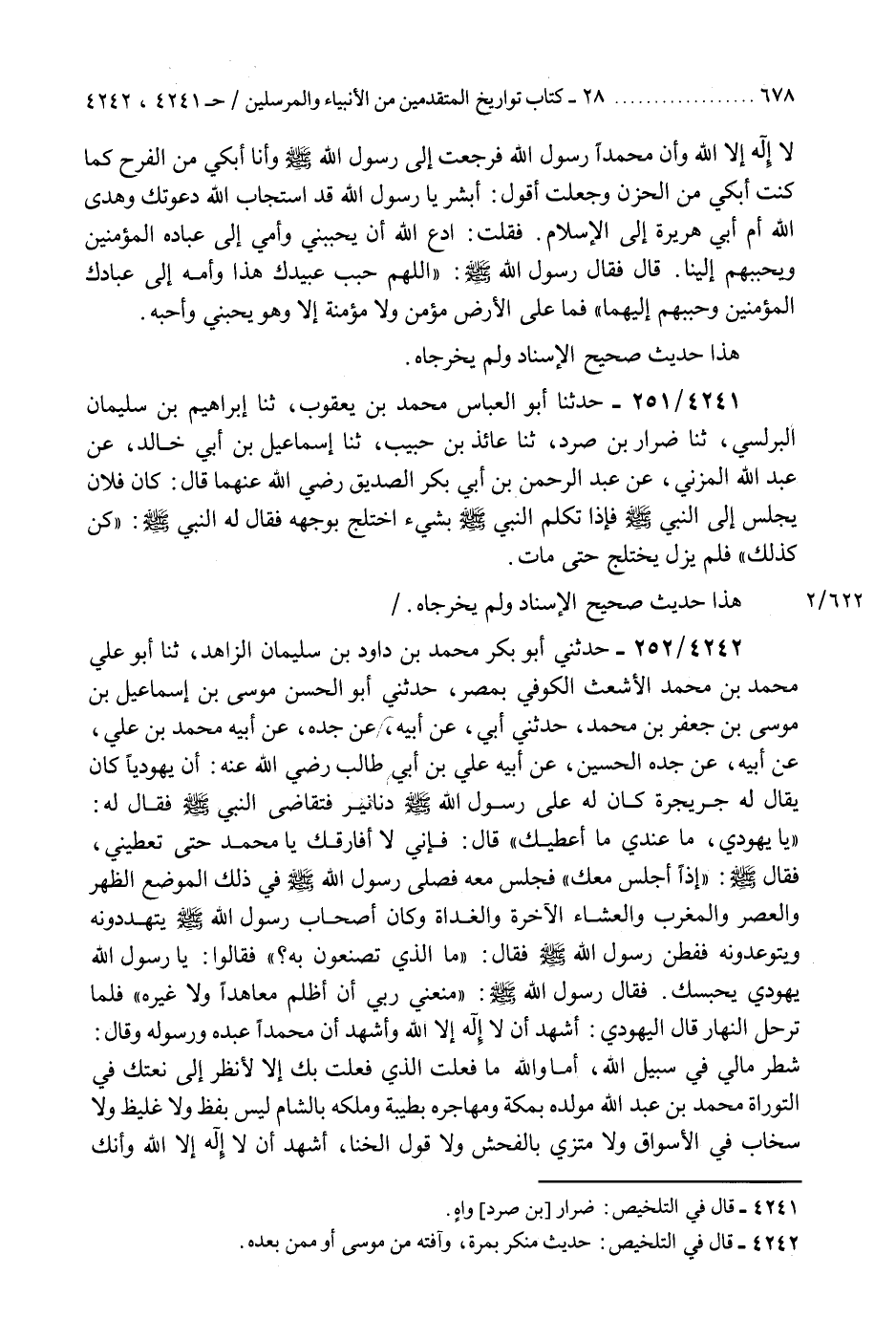 4242 - حَدَّثَنِي أَبُو بَكْرٍ مُحَمَّدُ بْنُ دَاوُدَ بْنِ سُلَيْمَانَ الزَّاهِدُ، ثنا أَبُو عَلِيٍّ مُحَمَّدُ بْنُ مُحَمَّدٍ الْأَشْعَثُ الْكُوفِيُّ بِمِصْرَ، حَدَّثَنِي أَبُو الْحَسَنِ مُوسَى بْنُ إِسْمَاعِيلَ بْنِ مُوسَى بْنِ جَعْفَرِ بْنِ مُحَمَّدٍ، حَدَّثَنِي أَبِي، عَنْ أَبِيهِ، عَنْ جَدِّهِ، عَنْ أَبِيهِ مُحَمَّدِ بْنِ عَلِيٍّ، عَنْ أَبِيهِ، عَنْ جَدِّهِ الْحُسَيْنِ، عَنْ أَبِيهِ عَلِيِّ بْنِ أَبِي طَالِبٍ رَضِيَ اللَّهُ عَنْهُ، أَنْ يَهُودِيًّا، كَانَ يُقَالَ لَهُ جُرَيْجِرَةُ كَانَ لَهُ عَلَى رَسُولِ اللَّهِ صَلَّى اللهُ عَلَيْهِ وَسَلَّمَ دَنَانِيرُ فَتَقَاضَى النَّبِيَّ صَلَّى اللهُ عَلَيْهِ وَسَلَّمَ فَقَالَ لَهُ: «يَا يَهُودِيُّ، مَا عِنْدِي مَا أُعْطِيكَ» قَالَ: فَإِنِّي لَا أُفَارِقُكَ يَا مُحَمَّدُ حَتَّى تُعْطِيَنِي، فَقَالَ صَلَّى اللهُ عَلَيْهِ وَسَلَّمَ: «إِذًا أَجْلِسُ مَعَكَ» فَجَلَسَ مَعَهُ فَصَلَّى رَسُولُ اللَّهِ صَلَّى اللهُ عَلَيْهِ وَسَلَّمَ فِي ذَلِكَ الْمَوْضِعِ الظُّهْرَ وَالْعَصْرَ وَالْمَغْرِبَ وَالْعِشَاءَ الْآخِرَةَ وَالْغَدَاةَ وَكَانَ أَصْحَابُ رَسُولِ اللَّهِ صَلَّى اللهُ عَلَيْهِ وَسَلَّمَ يَتَهَدَّدُونَهُ، وَيَتَوَعَّدُونَهُ فَفَطِنَ رَسُولُ اللَّهِ صَلَّى اللهُ عَلَيْهِ وَسَلَّمَ فَقَالَ: «مَا الَّذِي تَصْنَعُونَ بِهِ؟» فَقَالُوا: يَا رَسُولَ اللَّهِ، يَهُودِيٌّ يَحْبِسُكَ، فَقَالَ رَسُولُ اللَّهِ صَلَّى اللهُ عَلَيْهِ وَسَلَّمَ: §«مَنَعَنِي رَبِّي أَنْ أَظْلِمَ مُعَاهَدًا وَلَا غَيْرَهُ» فَلَمَّا تَرَحَّلَ النَّهَارُ قَالَ الْيَهُودِيُّ: أَشْهَدُ أَنْ لَا إِلَهَ إِلَّا اللَّهُ وَأَشْهَدُ أَنَّ مُحَمَّدًا عَبْدُهُ وَرَسُولُهُ، وَقَالَ: شَطْرُ مَالِي فِي سَبِيلِ اللَّهِ أَمَا وَاللَّهِ مَا فَعَلْتُ الَّذِي فَعَلْتُ بِكَ إِلَّا لِأَنْظُرَ إِلَى نَعْتِكَ فِي التَّوْرَاةِ: مُحَمَّدُ بْنُ عَبْدِ اللَّهِ مَوْلِدُهُ بِمَكَّةَ، وَمُهَاجَرُهُ بِطَيْبَةَ وَمُلْكُهُ بِالشَّامِ لَيْسَ بِفَظٍّ وَلَا غَلِيظٍ وَلَا سَخَّابٍ فِي الْأَسْوَاقِ وَلَا مُتَزَيٍّ بِالْفُحْشِ، وَلَا قَوْلِ الْخَنَا، أَشْهَدُ أَنْ لَا إِلَهَ إِلَّا اللَّهُ وَأَنَّكَ رَسُولُ اللَّهِ، هَذَا مَالِي فَاحْكُمْ فِيهِ بِمَا أَرَاكَ اللَّهُ، وَكَانَ الْيَهُودِيُّ كَثِيرَ الْمَالِK4242 - حديث منكر بمرة