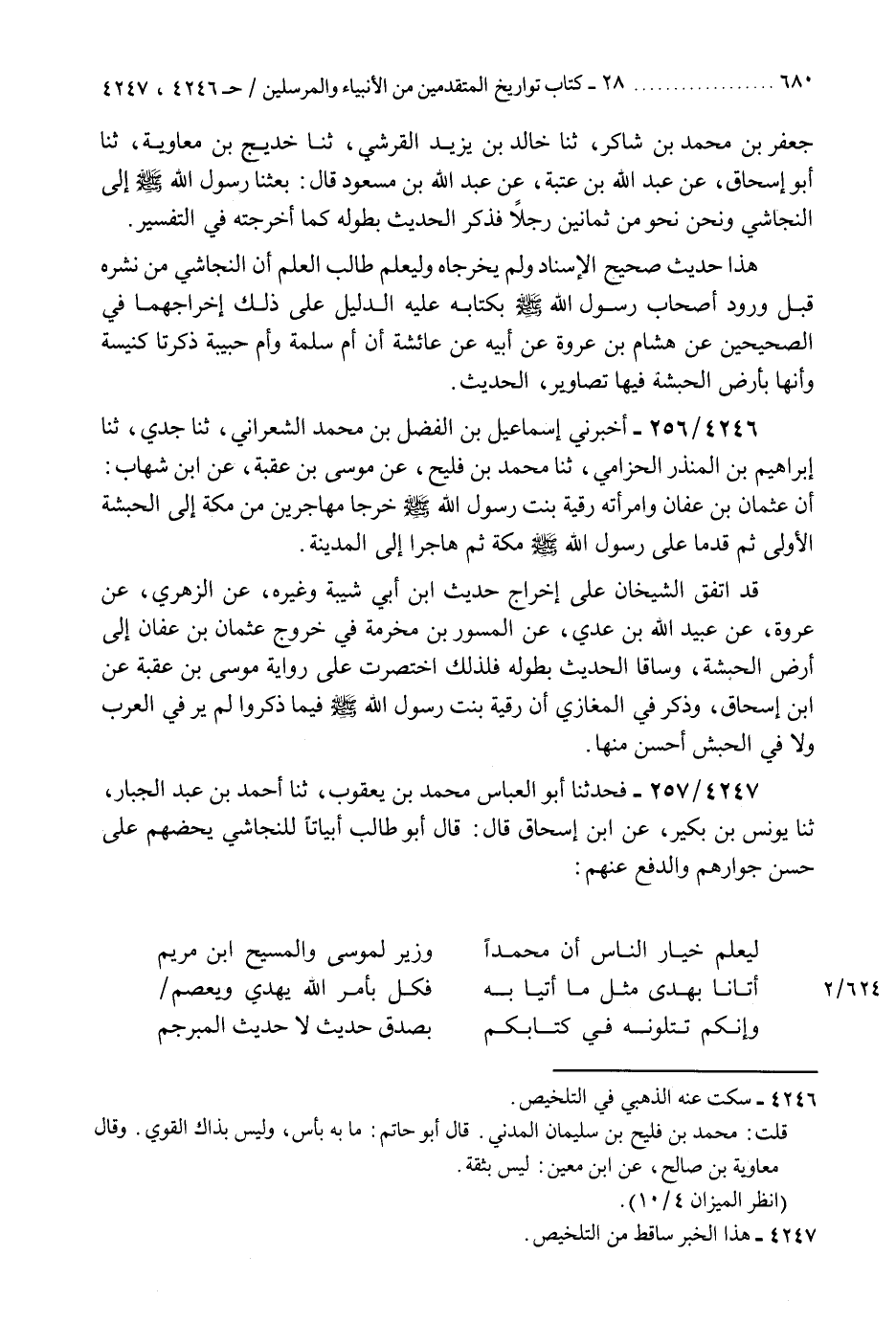 4246 - أَخْبَرَنِي إِسْمَاعِيلُ بْنُ الْفَضْلِ بْنِ مُحَمَّدٍ الشَّعْرَانِيُّ، ثنا جَدِّي، ثنا إِبْرَاهِيمُ بْنُ الْمُنْذِرِ الْحِزَامِيُّ، ثنا مُحَمَّدُ بْنُ فُلَيْحٍ، عَنْ مُوسَى بْنِ عُقْبَةَ، عَنِ ابْنِ شِهَابٍ: «أَنَّ عُثْمَانَ بْنَ عَفَّانَ، وَامْرَأَتُهُ رُقْيَةُ بِنْتُ رَسُولِ اللَّهِ صَلَّى اللهُ عَلَيْهِ وَسَلَّمَ §خَرَجَا مُهَاجِرَيْنِ مِنْ مَكَّةَ إِلَى الْحَبَشَةِ الْأُولَى، ثُمَّ قَدِمَا عَلَى رَسُولِ اللَّهِ صَلَّى اللهُ عَلَيْهِ وَسَلَّمَ مَكَّةَ، ثُمَّ هَاجَرَا إِلَى الْمَدِينَةِ» قَدِ اتَّفَقَ الشَّيْخَانِ عَلَى إِخْرَاجِ حَدِيثِ ابْنِ أَبِي شَيْبَةَ وَغَيْرِهِ عَنِ الزُّهْرِيِّ، عَنْ عُرْوَةَ، عَنْ عُبَيْدِ اللَّهِ بْنِ عَدِيٍّ، عَنِ الْمِسْوَرِ بْنِ مَخْرَمَةَ، فِي خُرُوجِ عُثْمَانَ بْنِ عَفَّانَ إِلَى أَرْضِ الْحَبَشَةِ وَسَاقَا الْحَدِيثَ بِطُولِهِ فَلِذَلِكَ اخْتَصَرْتُ عَلَى رِوَايَةِ مُوسَى بْنِ عُقْبَةَ عَنِ ابْنِ إِسْحَاقَ، وَذَكَرَ فِي الْمَغَازِي أَنَّ رُقْيَةَ بِنْتَ رَسُولِ اللَّهِ صَلَّى اللهُ عَلَيْهِ وَسَلَّمَ فِيمَا ذَكَرُوا لَمْ يُرَ فِي الْعَرَبِ وَلَا فِي الْحَبَشِ أَحْسَنَ مِنْهَا "K4246 - سكت عنه الذهبي في التلخيص