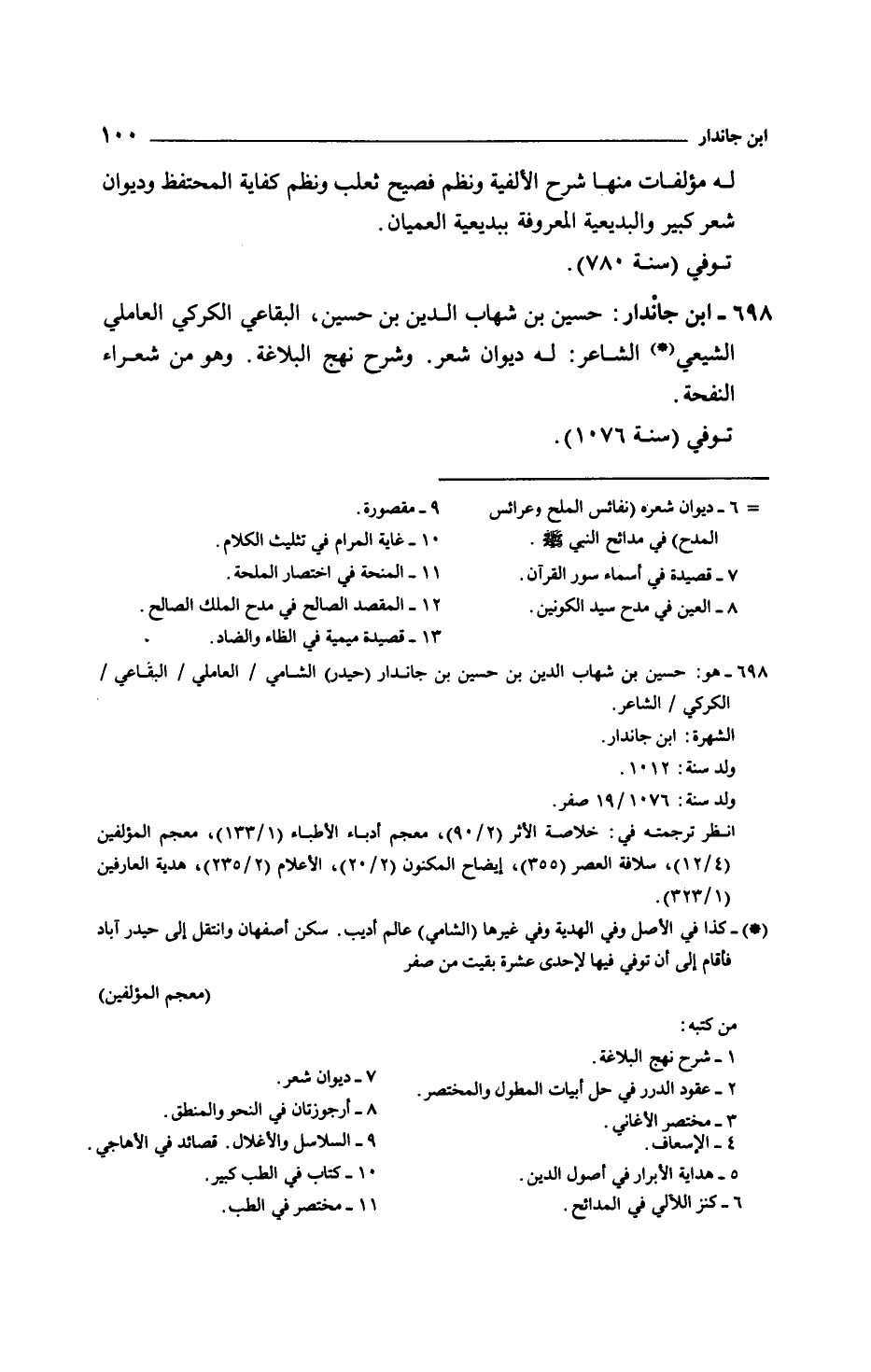 ابن جاندار: حسين بن شهاب الدين بن حسين، البقاعي الكركي العاملي الشيعي الشاعر: له ديوان شعر. وشرح نهج البلاغة. وهو من شعراء النفحة.