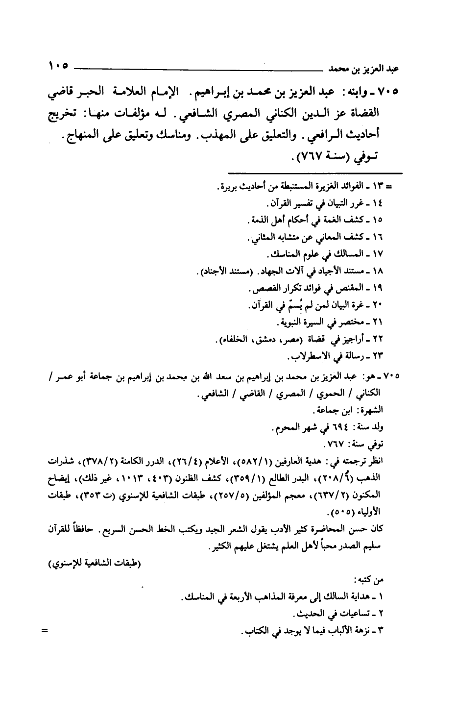 وابنه: عبد العزيز بن محمد بن إبراهيم. الإمام العلامة الحبر قاضي القضاة عز الدين الكناني المصري الشافعي. له مؤلفات منها: تخريج أحاديث الرافعي. والتعليق على المهذب. ومناسك وتعليق على المنهاج.