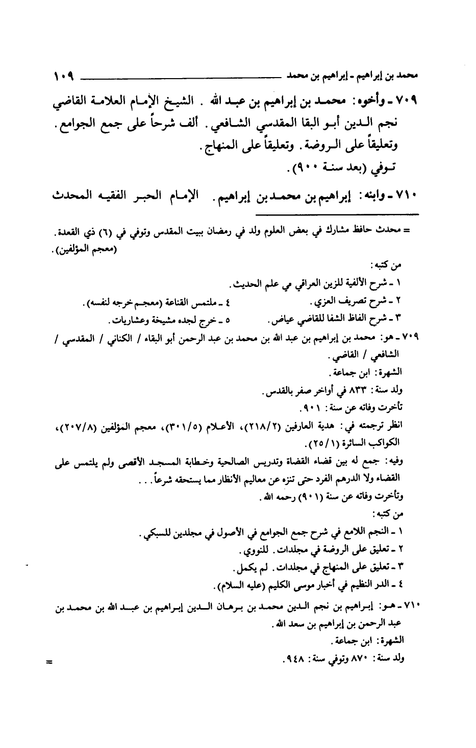 وأخوه: محمد بن إبراهيم بن عبد الله. الشيخ الإمام العلامة القاضي نجم الدين أبو البقا المقدسي الشافعي. ألف شرحاً على جمع الجوامع. وتعليقاً على الروضة. وتعليقاً على المنهاج.