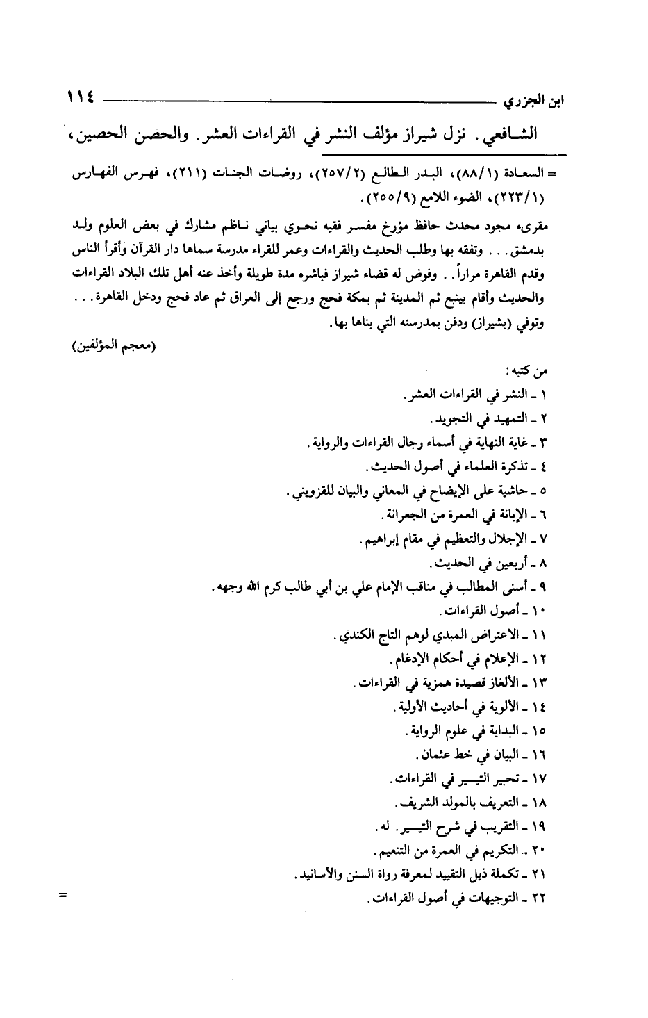الشافعي. نزل شيراز مؤلف النشر في القراءات العشر. والحصن الحصين،