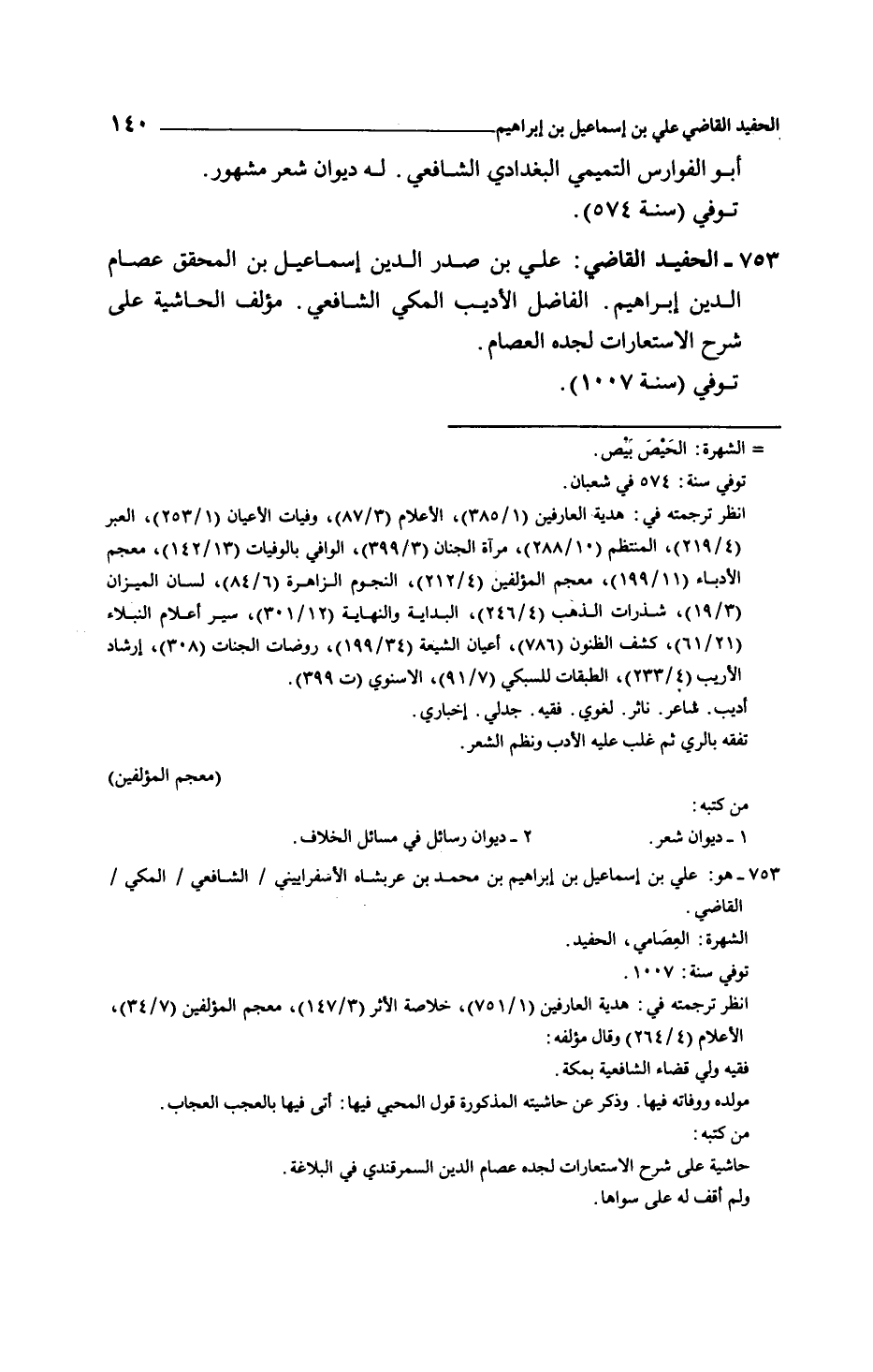 الحفيد القاضي: علي بن صدر الدين إسماعيل بن المحقق عصام الدين إبراهيم. الفاضل الأديب المكي الشافعي. مؤلف الحاشية على شرح الاستعارات لجده العصام.