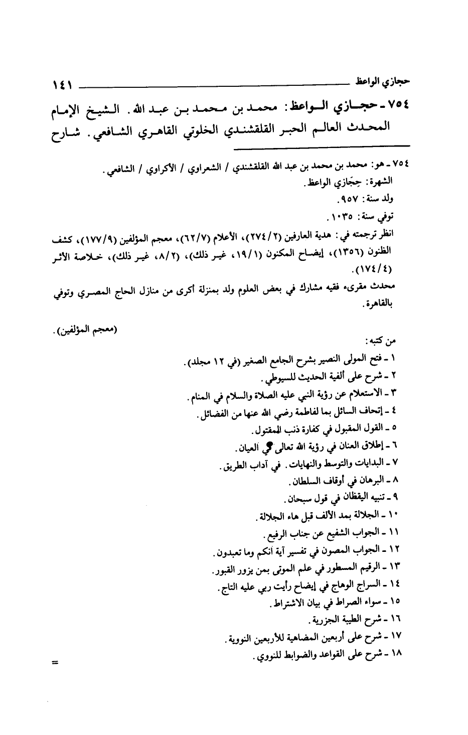 حجازي الواعظ: محمد بن محمد بن عبد الله. الشيخ الإمام المحدث العالم الحبر القلقشندي الخلوتي القاهري الشافعي. شارح