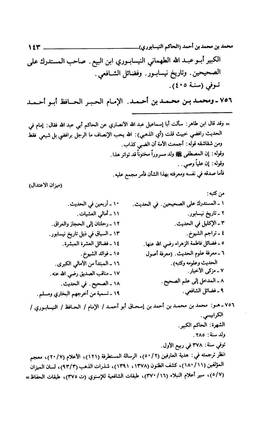 الكبير أبو عبد الله الطهماني النيسابوري ابن البيع. صاحب المستدرك على الصحيحين. وتاريخ نيسابور. وفضائل الشافعي.