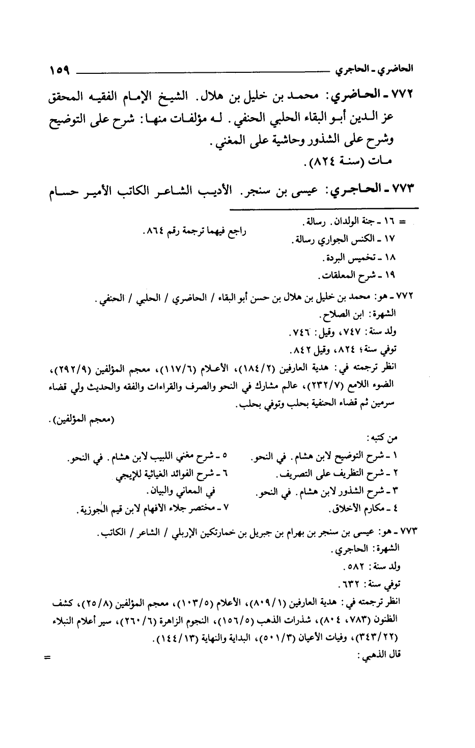 الحاضري: محمد بن خليل بن هلال. الشيخ الإمام الفقيه المحقق عز الدين أبو البقاء الحلبي الحنفي. له مؤلفات منها: شرح على التوضيح وشرح على الشذور وحاشية على المغني.