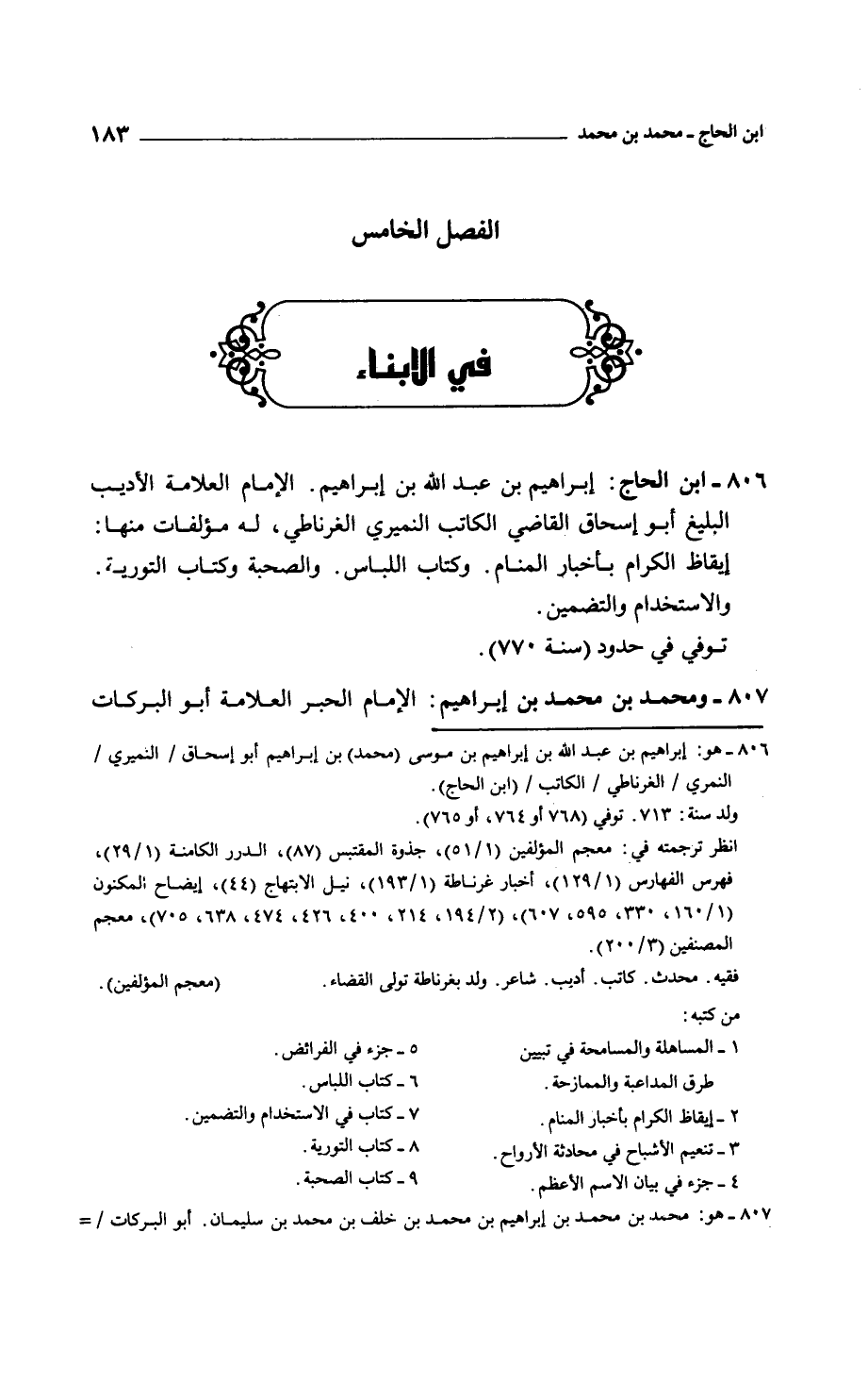ابن الحاج: إبراهيم بن عبد الله بن إبراهيم. الإمام العلامة الأديب البليغ أبو إسحاق القاضي الكاتب النميري الغرناطي، له مؤلفات منها: إيقاظ الكرام بأخبار المنام. وكتاب اللباس. والصحبة وكتاب التورية. والاستخدام والتضمين.