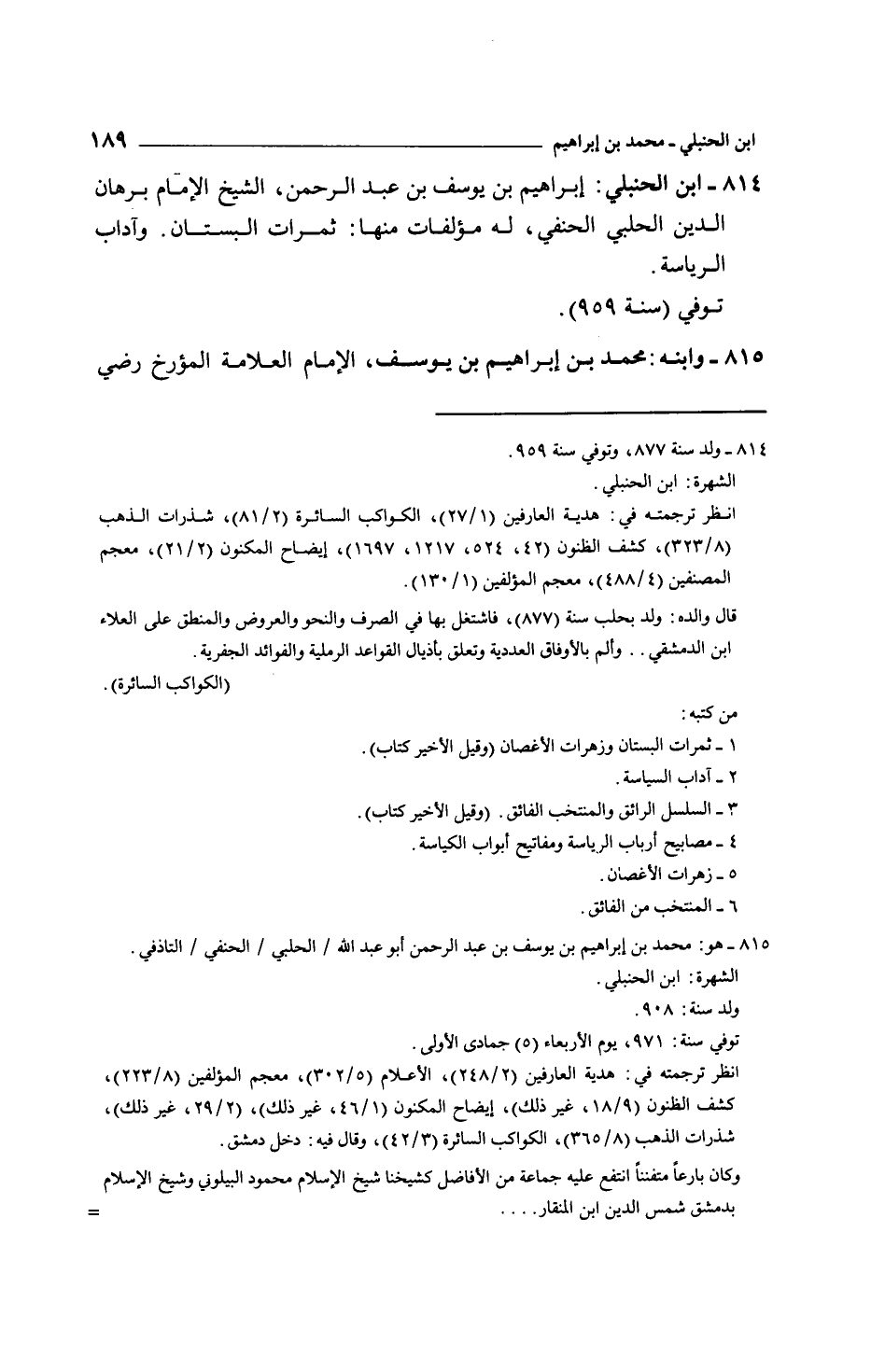 ابن الحنبلي: إبراهيم بن يوسف بن عبد الرحمن، الشيخ الإمام برهان الدين الحلبي الحنفي، له مؤلفات منها: ثمرات البستان. وآداب الرياسة.