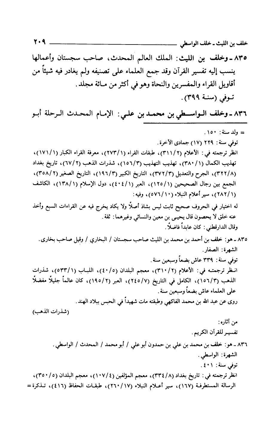 وخلف بن الليث: الملك العالم المحدث، صاحب سجستان وأعمالها ينسب إليه تفسير القرآن وقد جمع العلماء على تصنيفه ولم يغادر فيه شيئاً من أقاويل القراء والمفسرين والنحاة وهو في أكثر من مائة مجلد.