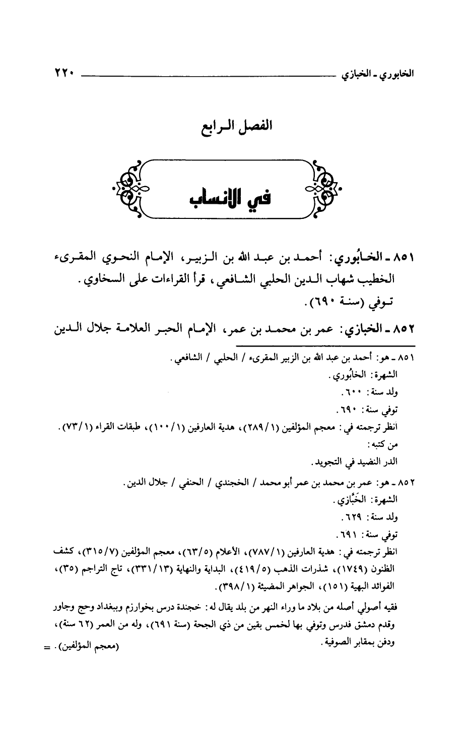 الخابوري: أحمد بن عبد الله بن الزبير، الإمام النحوي المقرىء الخطيب شهاب الدين الحلبي الشافعي، قرأ القراءات على السخاوي.