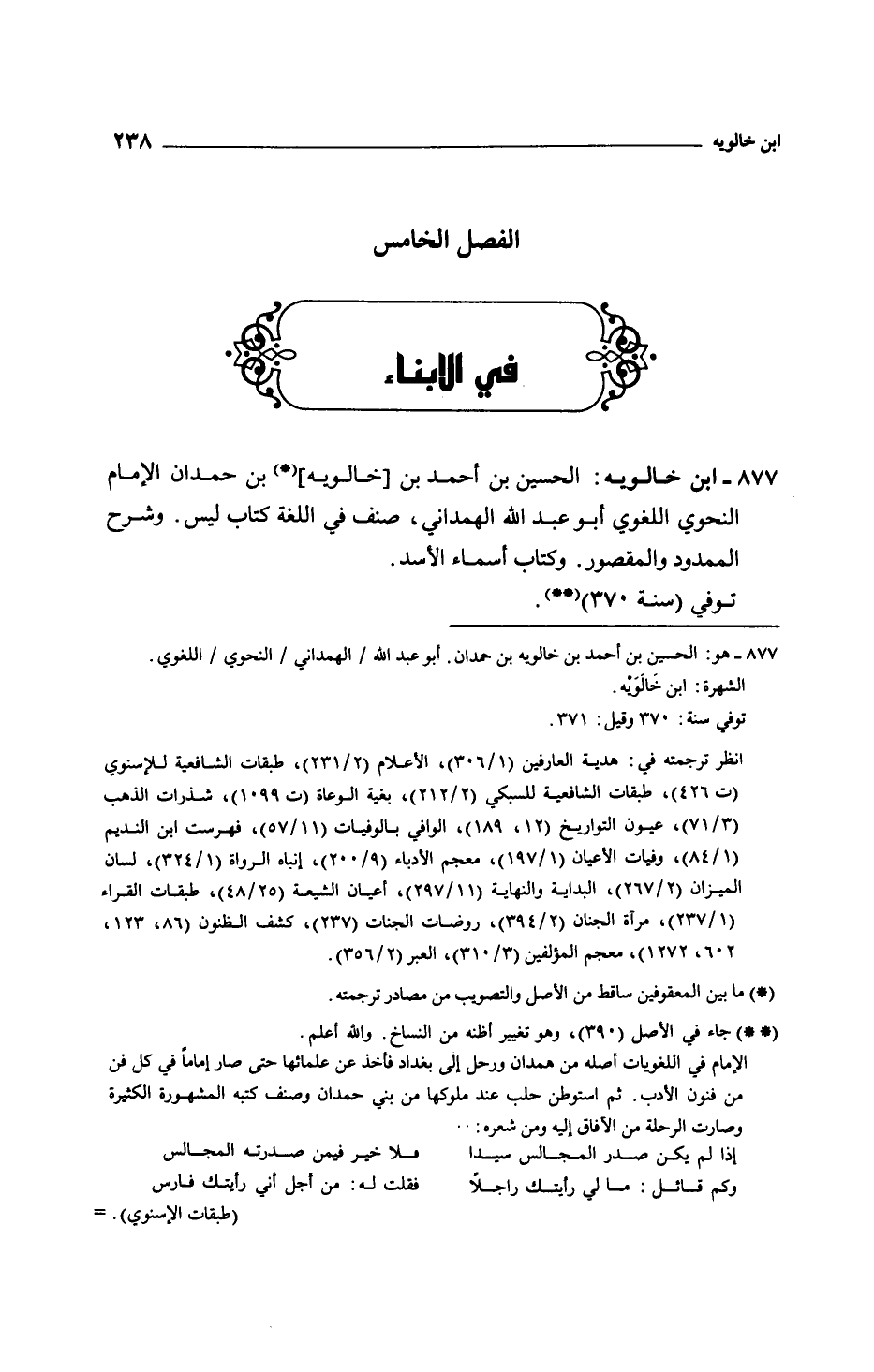ابن خالويه: الحسين بن أحمد بن خالويه بن حمدان الإمام النحوي اللغوي أبو عبد الله الهمداني، صنف في اللغة كتاب ليس. وشرح الممدود والمقصور. وكتاب أسماء الأسد.