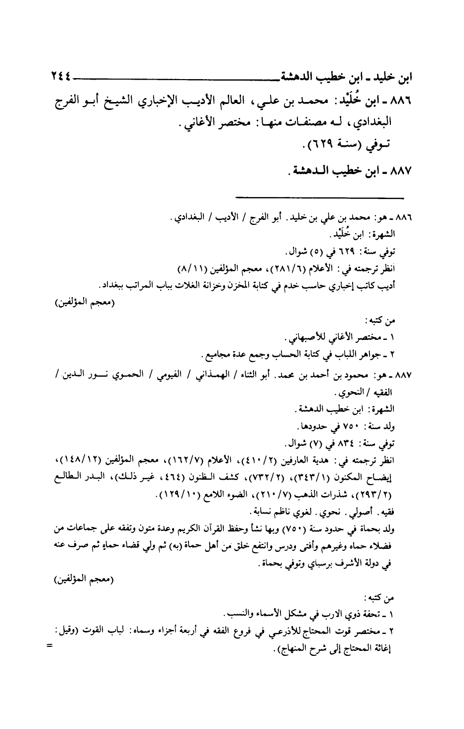 ابن خليد: محمد بن علي، العالم الأديب الإخباري الشيخ أبو الفرج البغدادي، له مصنفات منها: مختصر الأغاني.