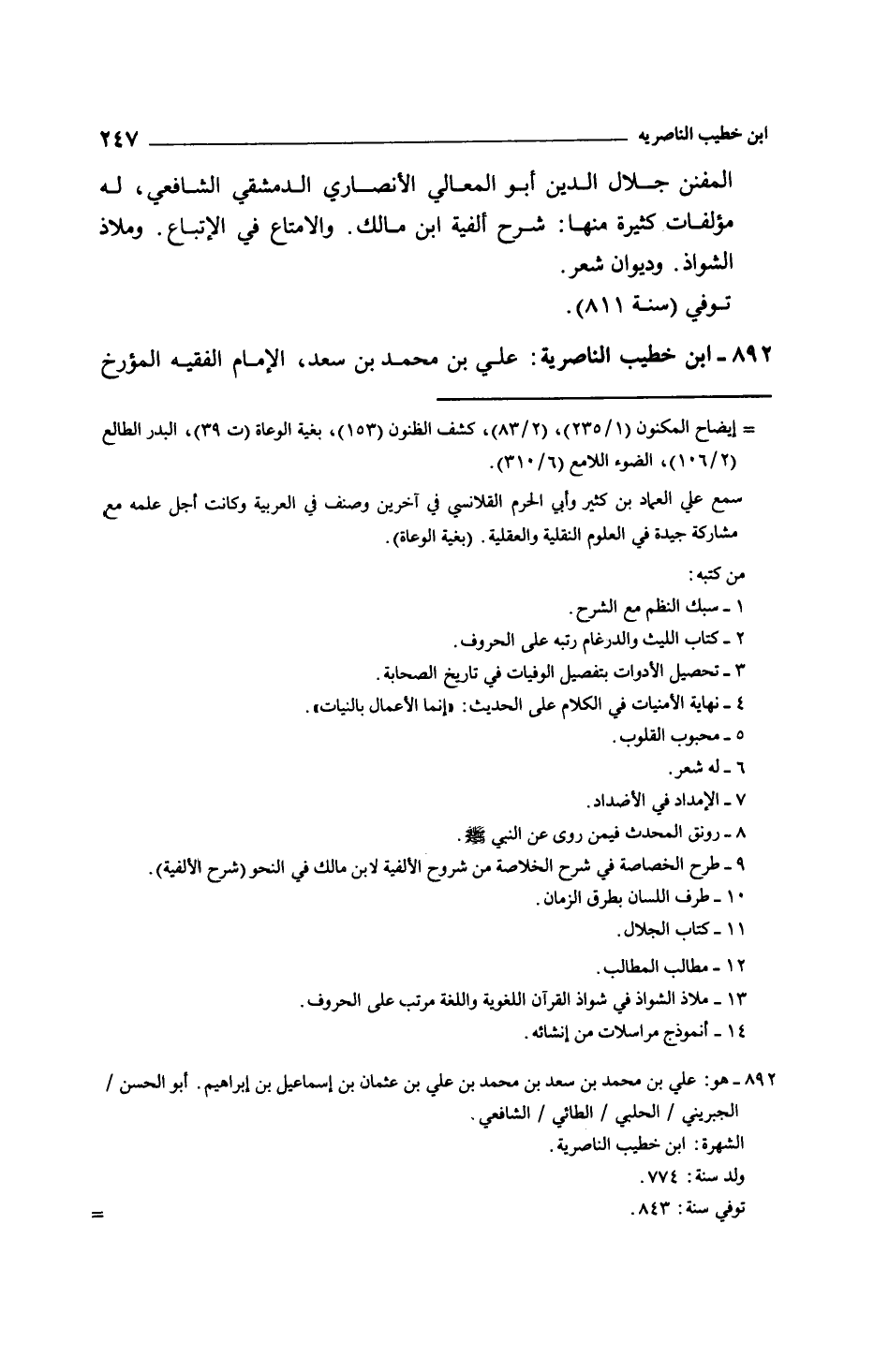 المفنن جلال الدين أبو المعالي الأنصاري الدمشقي الشافعي، له مؤلفات كثيرة منها: شرح ألفية ابن مالك. والامتاع في الإتباع. وملاذ الشواذ. وديوان شعر.