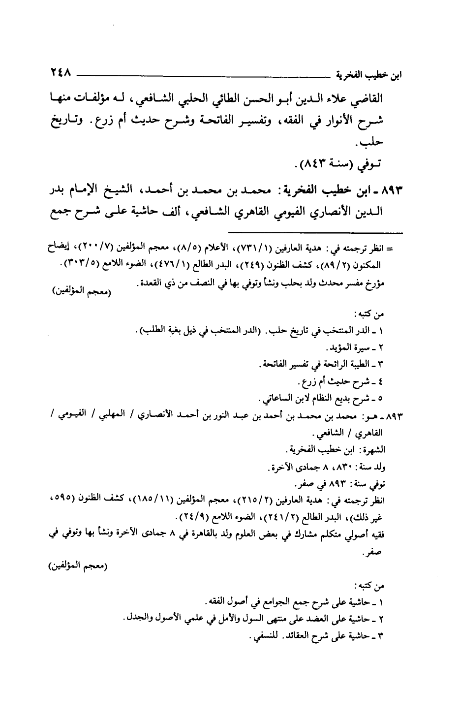 ابن خطيب الفخرية: محمد بن محمد بن أحمد، الشيخ الإمام بدر الدين الأنصاري الفيومي القاهري الشافعي، ألف حاشية على شرح جمع
