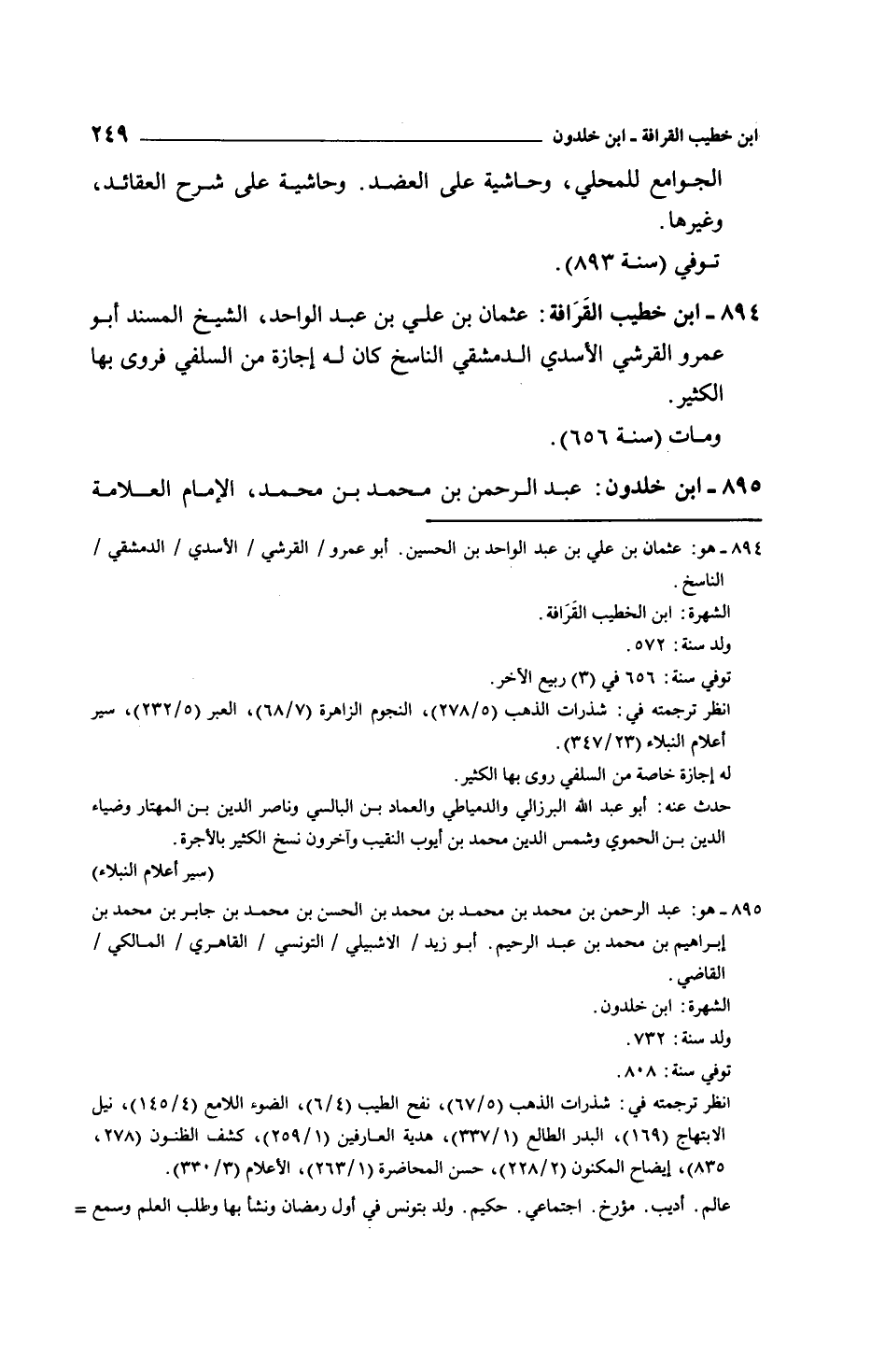 ابن خطيب القرافة: عثمان بن علي بن عبد الواحد، الشيخ المسند أبو عمرو القرشي الأسدي الدمشقي الناسخ كان له إجازة من السلفي فروى بها الكثير.