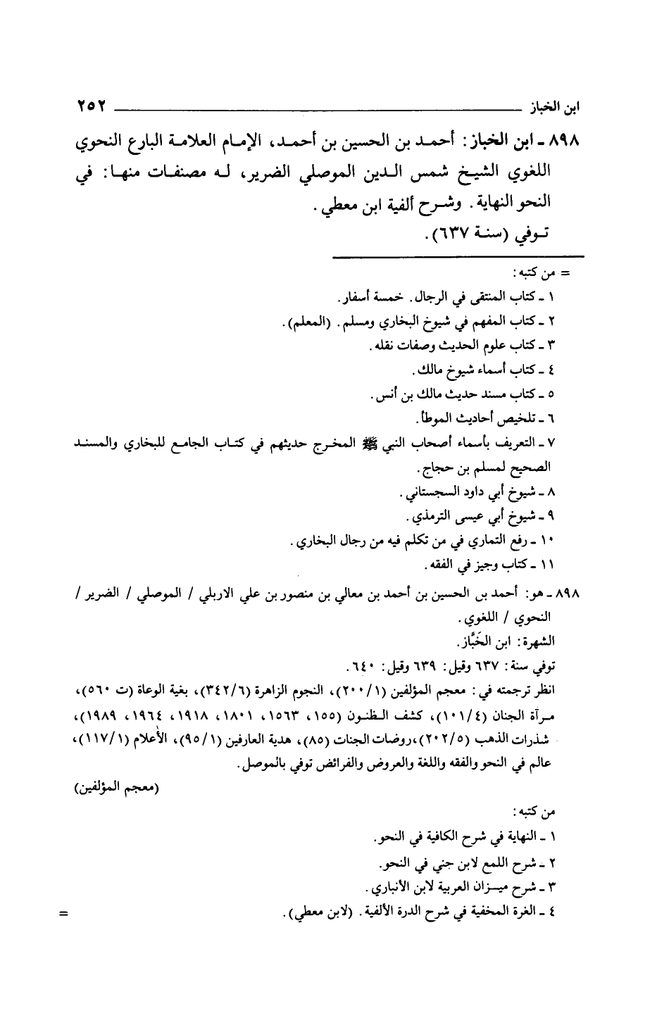 ابن الخباز: أحمد بن الحسين بن أحمد، الإمام العلامة البارع النحوي اللغوي الشيخ شمس الدين الموصلي الضرير، له مصنفات منها: في النحو النهاية. وشرح ألفية ابن معطي.
