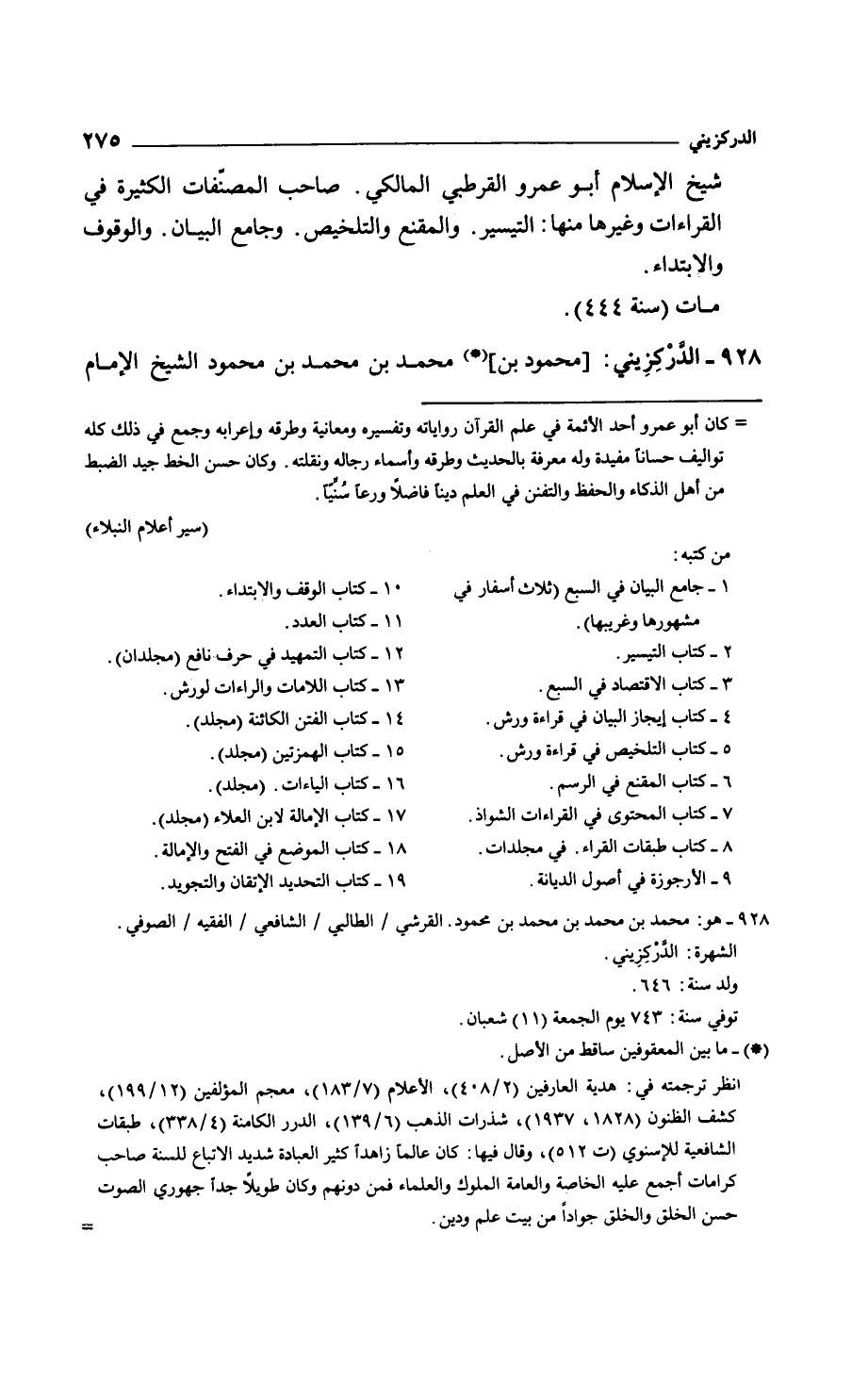 شيخ الإسلام أبو عمرو القرطبي المالكي. صاحب المصنفات الكثيرة في القراءات وغيرها منها: التيسير. والمقنع والتلخيص. وجامع البيان. والوقوف والابتداء.