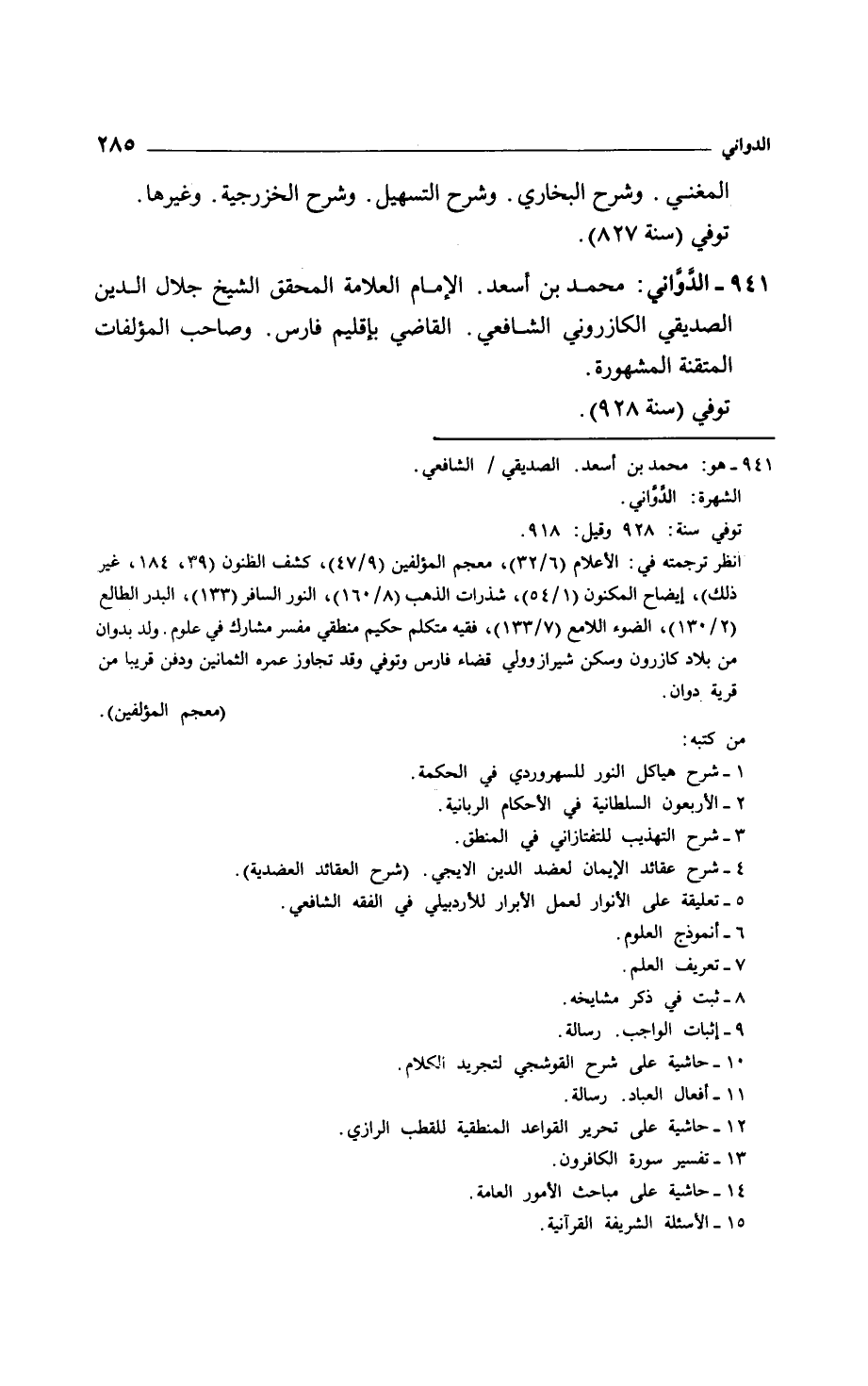 الدواني: محمد بن أسعد. الإمام العلامة المحقق الشيخ جلال الدين الصديقي الكازروني الشافعي. القاضي بإقليم فارس. وصاحب المؤلفات المتقنة المشهورة.