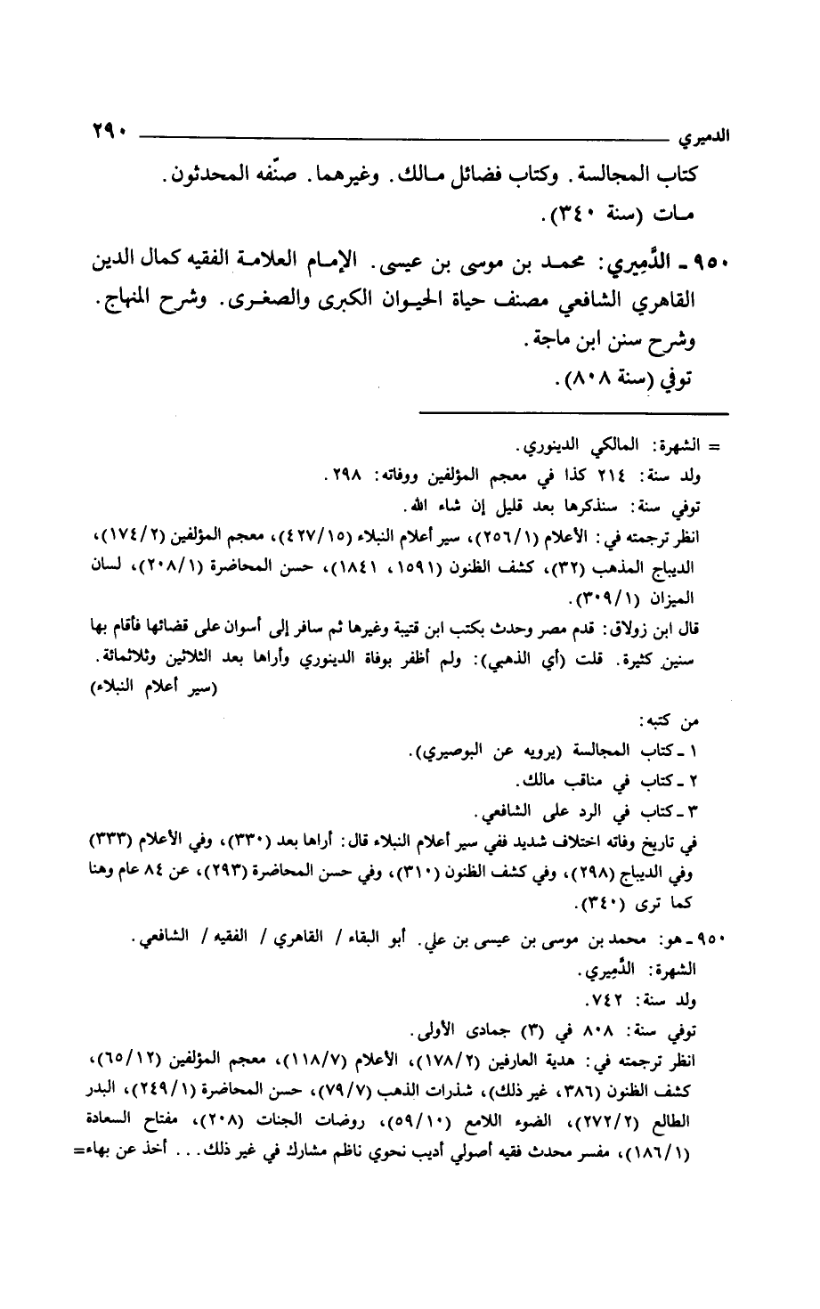 الدميري: محمد بن موسى بن عيسى. الإمام العلامة الفقيه كمال الدين القاهري الشافعي مصنف حياة الحيوان الكبرى والصغرى. وشرح المنهاج. وشرح سنن ابن ماجة.
