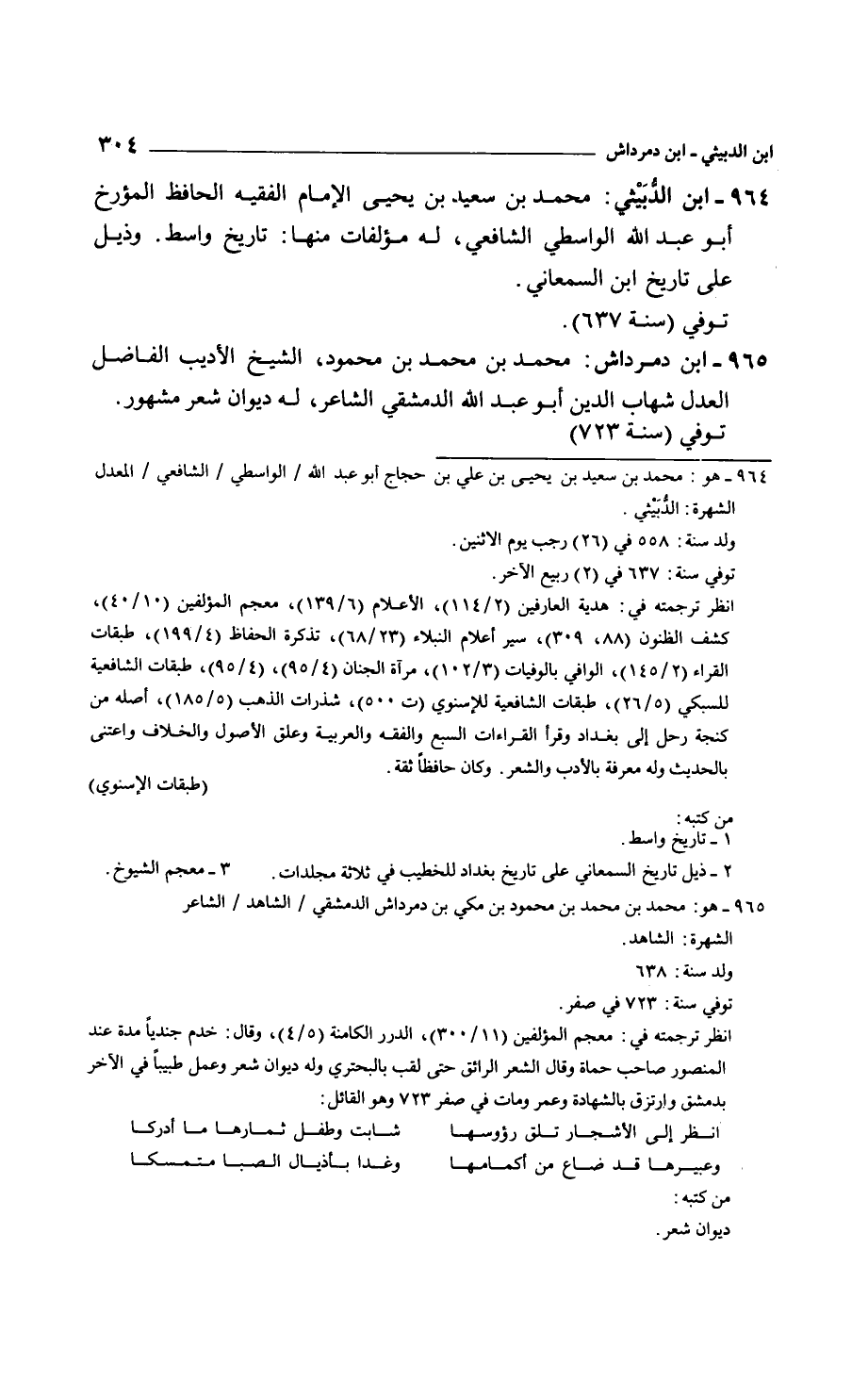 ابن الدبيثي: محمد بن سعيد بن يحيى الإمام الفقيه الحافظ المؤرخ أبو عبد الله الواسطي الشافعي، له مؤلفات منها: تاريخ واسط. وذيل على تاريخ ابن السمعاني.