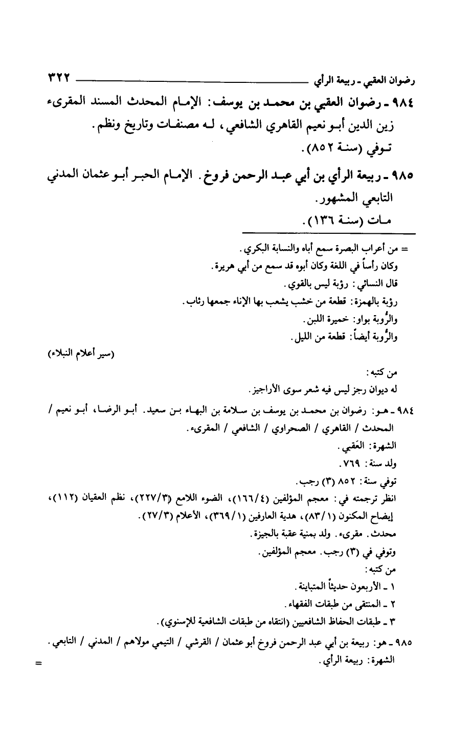 ربيعة الرأي بن أبي عبد الرحمن فروخ. الإمام الحبر أبو عثمان المدني التابعي المشهور.