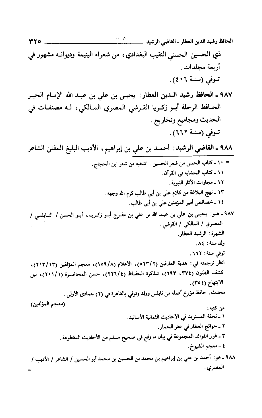 الحافظ رشيد الدين العطار: يحيى بن علي بن عبد الله الإمام الحبر الحافظ الرحلة أبو زكريا القرشي المصري المالكي، له مصنفات في الحديث ومجاميع وتخاريج.