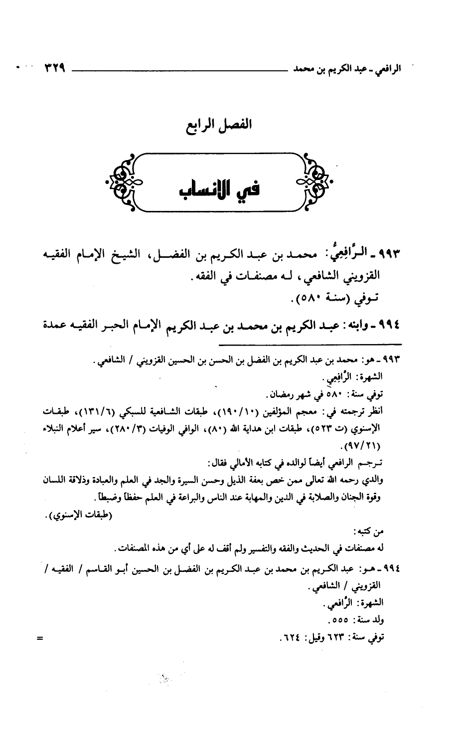 الرافعي: محمد بن عبد الكريم بن الفضل، الشيخ الإمام الفقيه القزويني الشافعي، له مصنفات في الفقه.