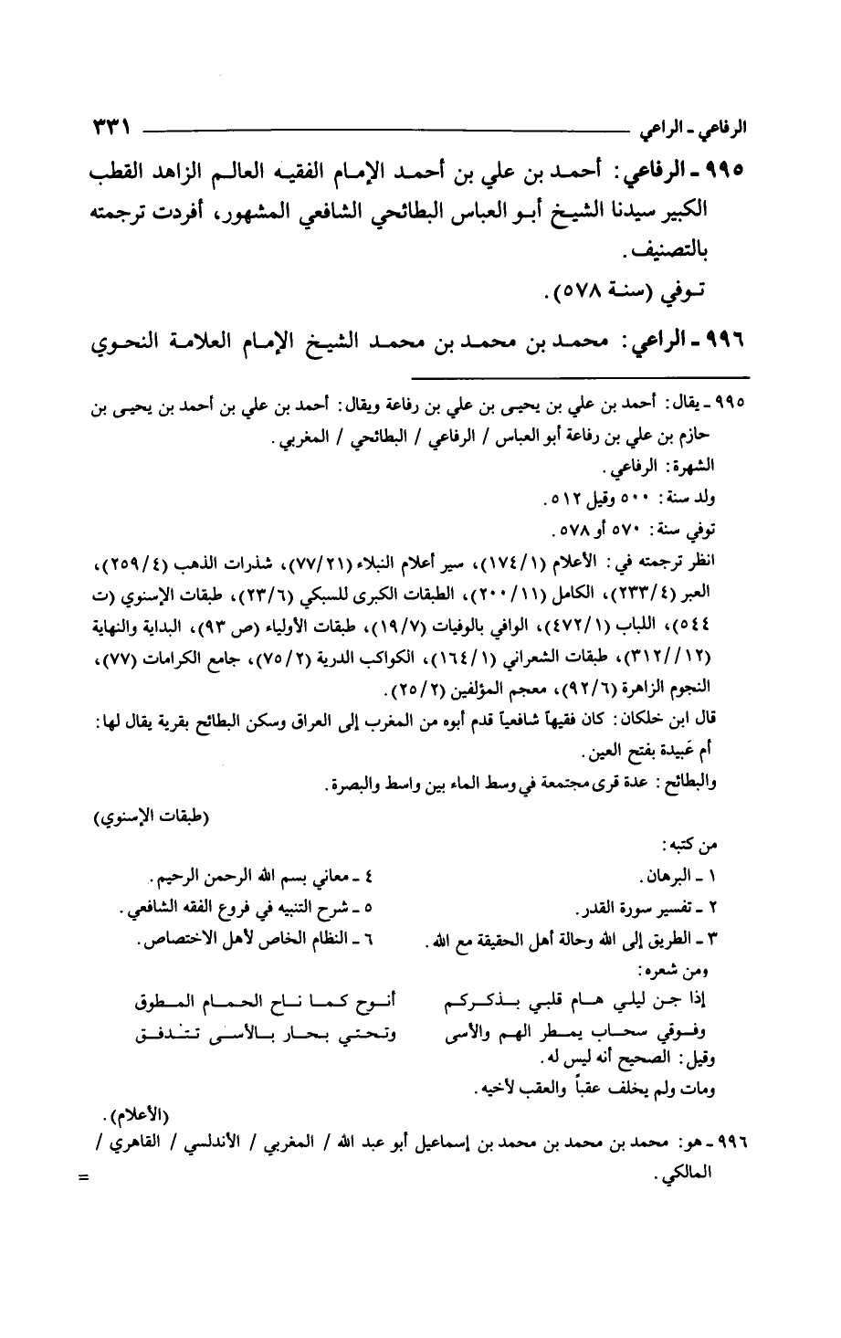 الرفاعي: أحمد بن علي بن أحمد الإمام الفقيه العالم الزاهد القطب الكبير سيدنا الشيخ أبو العباس البطائحي الشافعي المشهور، أفردت ترجمته بالتصنيف.