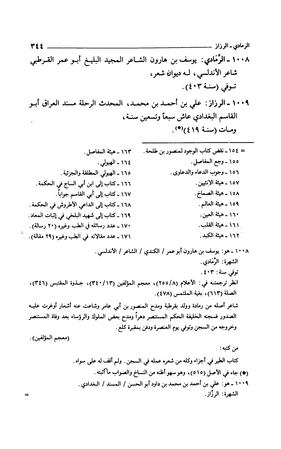 الرزاز: علي بن أحمد بن محمد، المحدث الرحلة مسند العراق أبو القاسم البغدادي عاش سبعاً وتسعين سنة، ومات سنة 419.