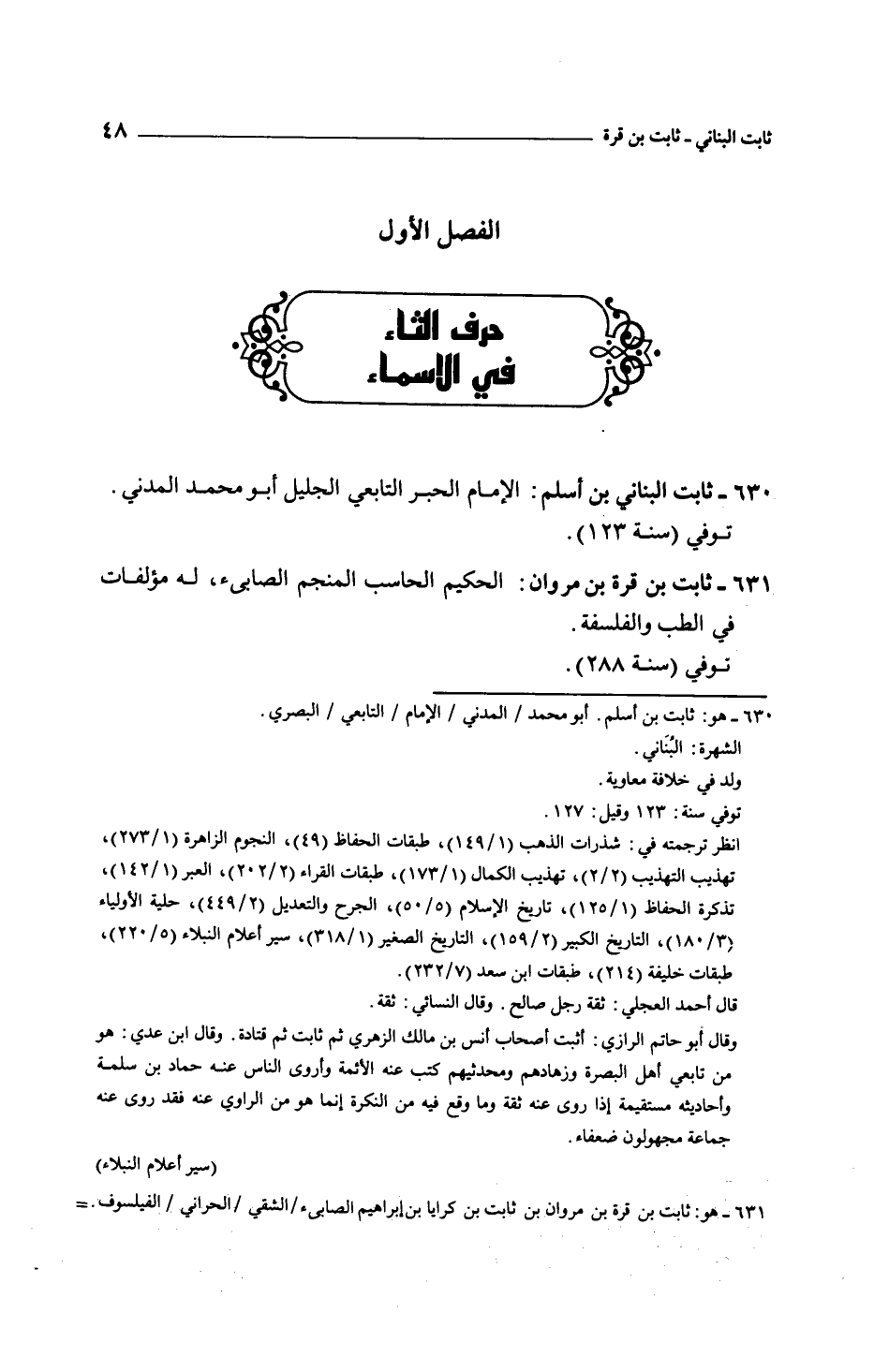 ثابت بن قرة بن مروان: الحكيم الحاسب المنجم الصابىء، له مؤلفات في الطب والفلسفة.