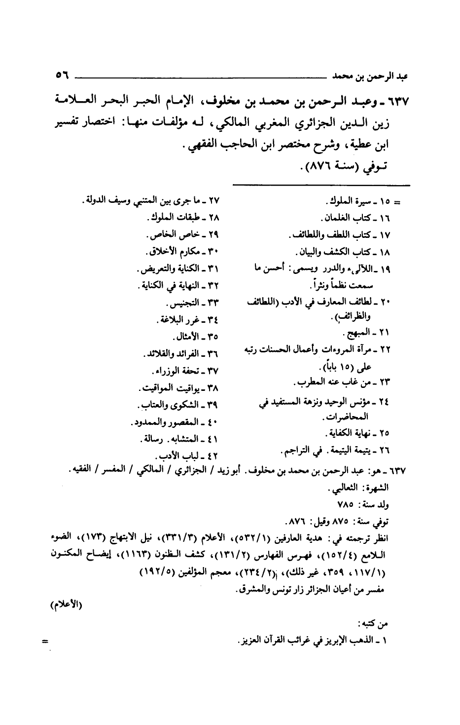 وعبد الرحمن بن محمد بن مخلوف، الإمام الحبر البحر العلامة زين الدين الجزائري المغربي المالكي، له مؤلفات منها: اختصار تفسير ابن عطية، وشرح مختصر ابن الحاجب الفقهي.