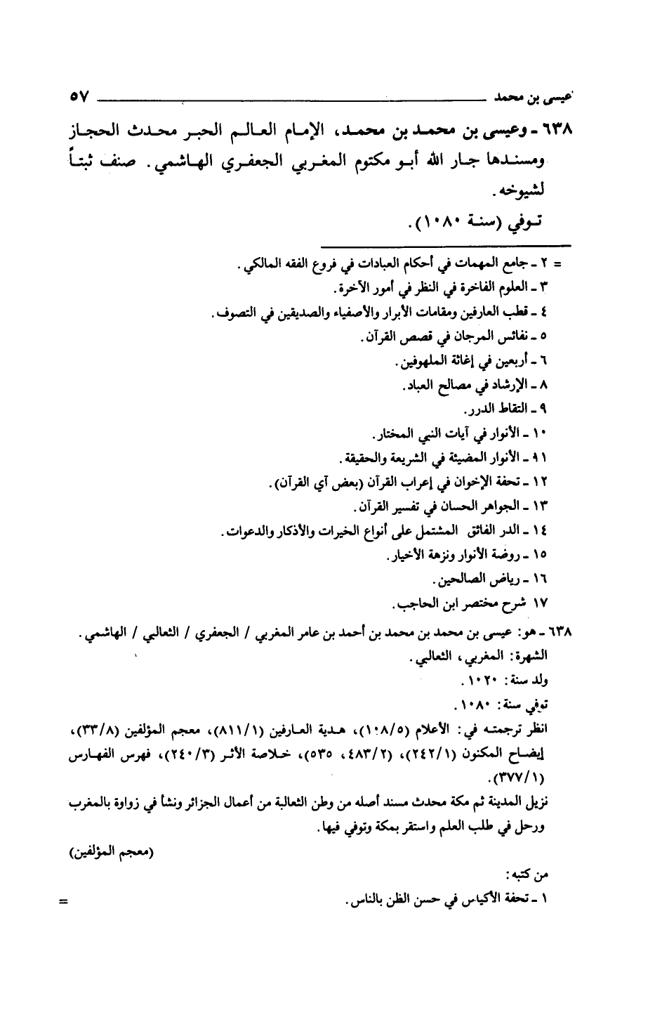 وعيسى بن محمد بن محمد، الإمام العالم الحبر محدث الحجاز ومسندها جار الله أبو مكتوم المغربي الجعفري الهاشمي. صنف ثبتاً لشيوخه.