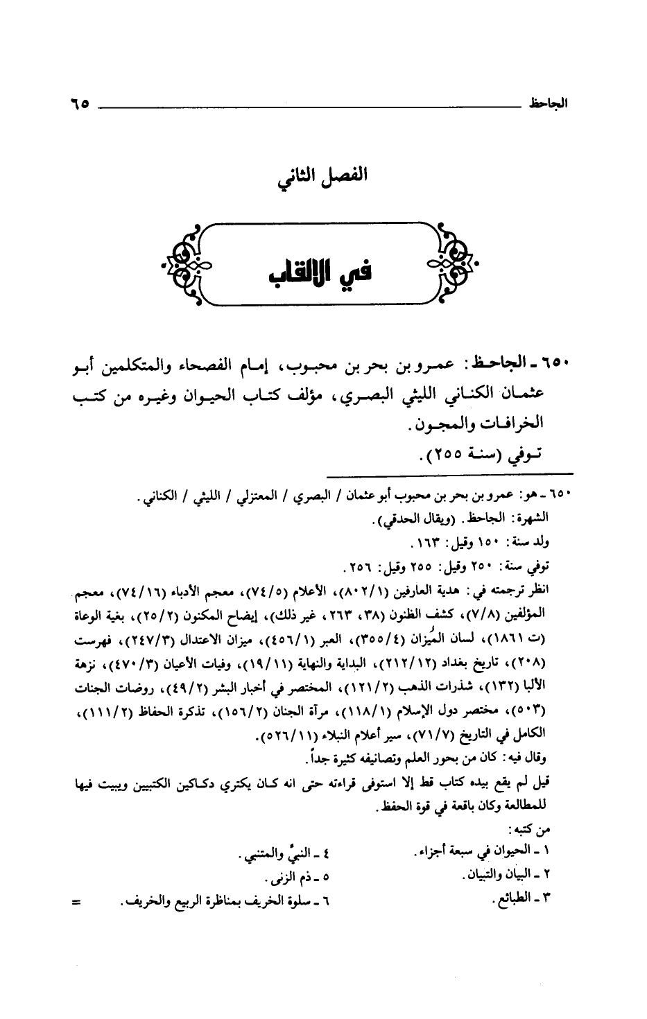 الجاحظ: عمرو بن بحر بن محبوب، إمام الفصحاء والمتكلمين أبو عثمان الكناني الليثي البصري، مؤلف كتاب الحيوان وغيره من كتب الخرافات والمجون.