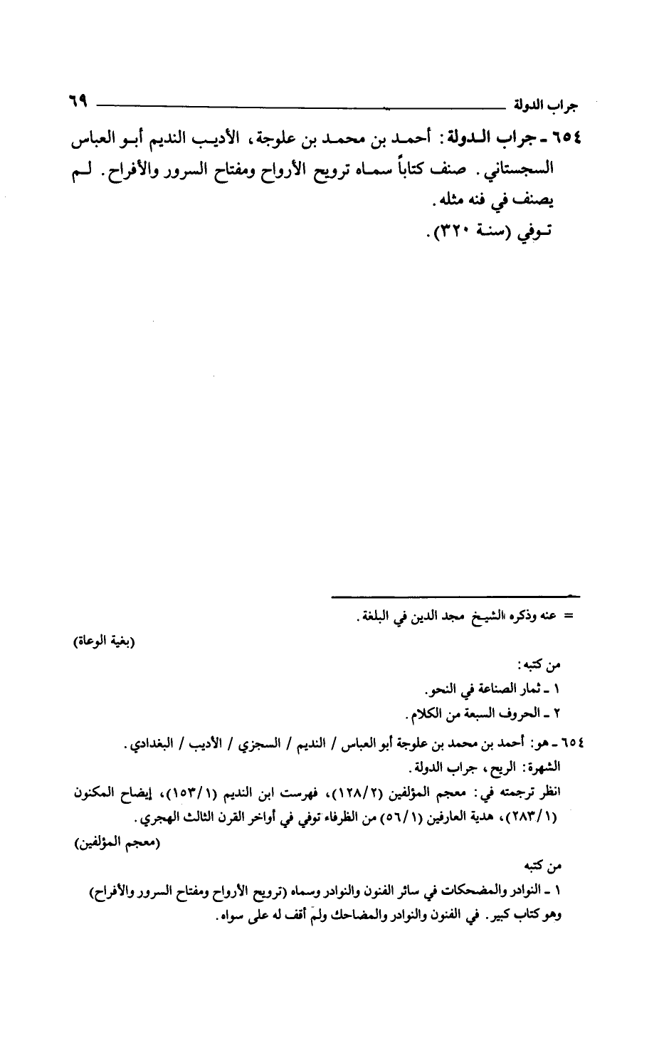 جراب الدولة: أحمد بن محمد بن علوجة، الأديب النديم أبو العباس السجستاني. صنف كتاباً سماه ترويح الأرواح ومفتاح السرور والأفراح. لم يصنف في فنه مثله.