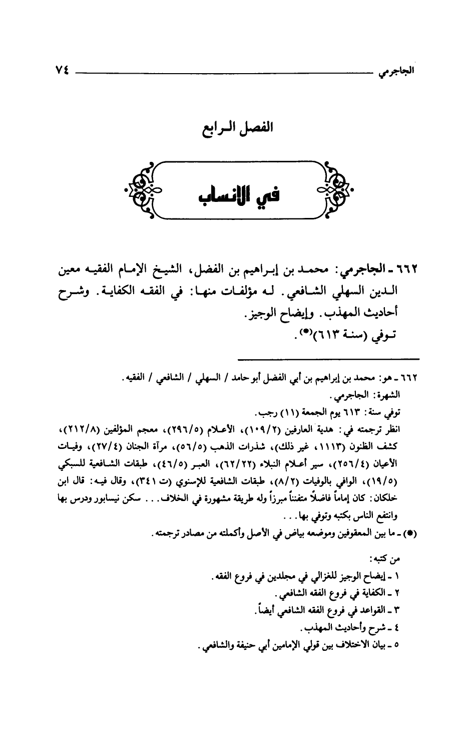 الجاجرمي: محمد بن إبراهيم بن الفضل، الشيخ الإمام الفقيه معين الدين السهلي الشافعي. له مؤلفات منها: في الفقه الكفاية. وشرح أحاديث المهذب. وإيضاح الوجيز.