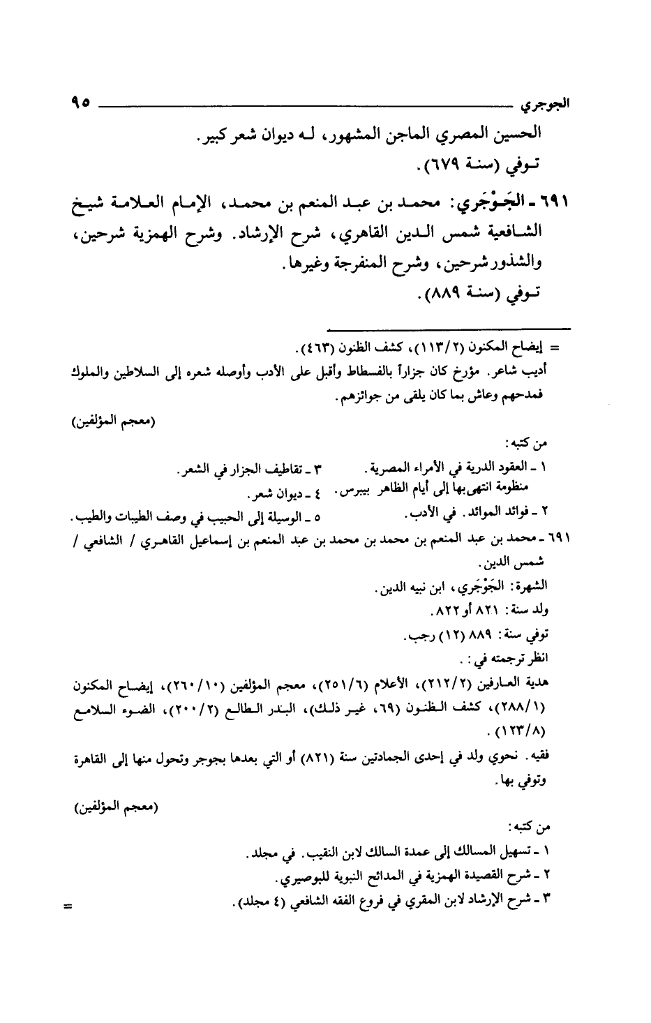 الجوجري: محمد بن عبد المنعم بن محمد، الإمام العلامة شيخ الشافعية شمس الدين القاهري، شرح الإرشاد. وشرح الهمزية شرحين، والشذور شرحين، وشرح المنفرجة وغيرها.