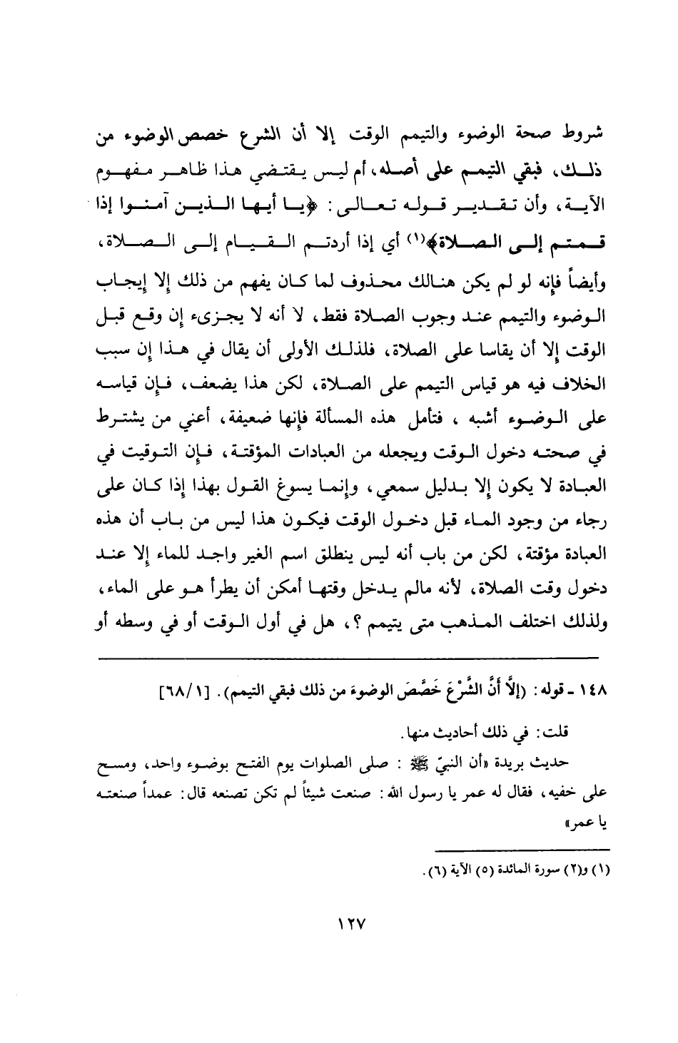 148 - قوله: "إلَّا أنَّ الشَّرْعَ خَصَّصَ الوضوءَ من ذلك فبقي التيمم).