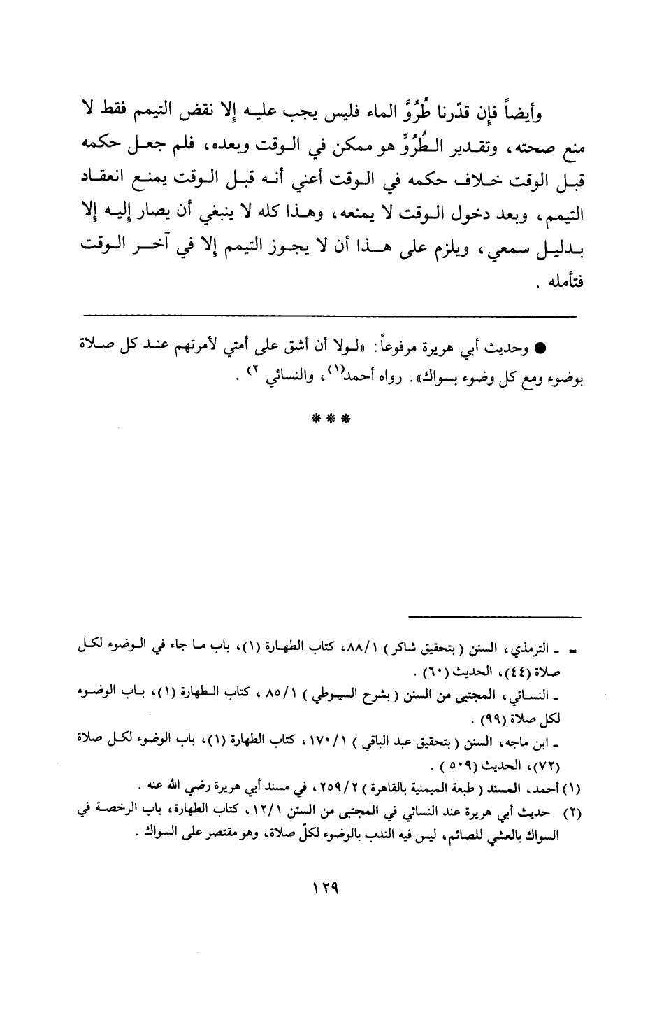 • وحديث أبي هريرة مرفوعًا: "لولا أن أشق على أمتي لأمرتهم عند كل صلاة بوضوء ومع كل وضوء بسواك". رواه أحمد، والنسائي.