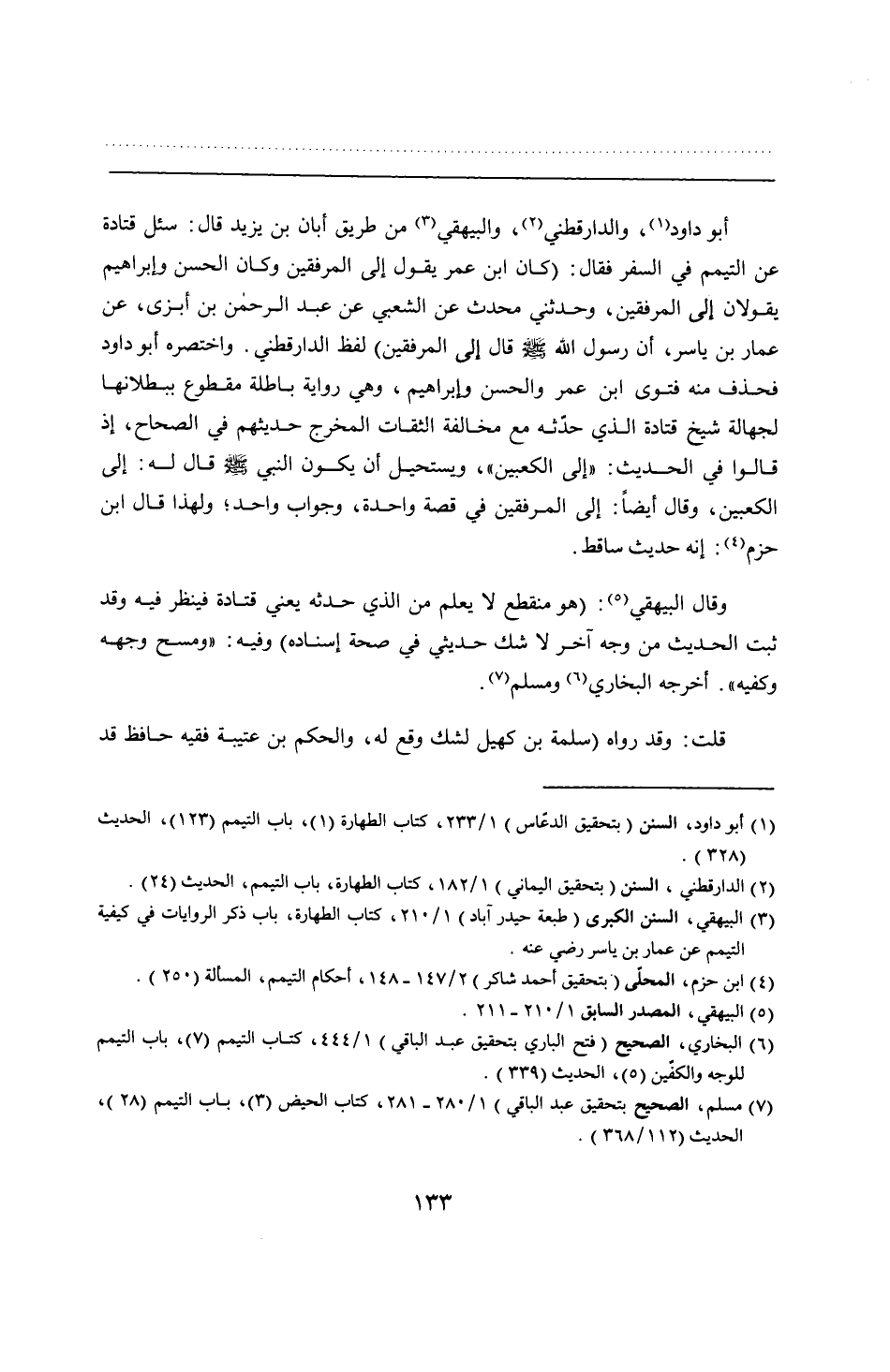 أبو داود، والدارقطني، والبيهقي من طريق أبان بن يزيد قال: سئل قتادة عن التيمم في السفر فقال: (كان ابن عمر يقول إلى المرفقين وكان الحسن وإبراهيم يقولان إلى المرفقين، وحدثني محدث عن الشعبي عن عبد الرحمن بن أبزى، عن عمار بن ياسر، أن رسول الله - صلى الله عليه وسلم - قال إلى المرفقين) لفظ الدارقطني. واختصره أبو داود فحذف منه فتوى ابن عمر والحسن وابراهيم، وهي رواية باطلة مقطوع ببطلانها لجهالة شيخ قتادة الذي حدّثه مع مخالفة الثقات المخرج حديثهم في الصحاح، إذ قالوا في الحديث: "إلى الكعبين"، ويستحيل أن يكون النبي - صلى الله عليه وسلم - قال له: إلى الكعبين، وقال أيضًا: إلى المرفقين في قصة واحدة، وجواب واحد؛ ولهذا قال ابن حزم: إنه حديث ساقط.