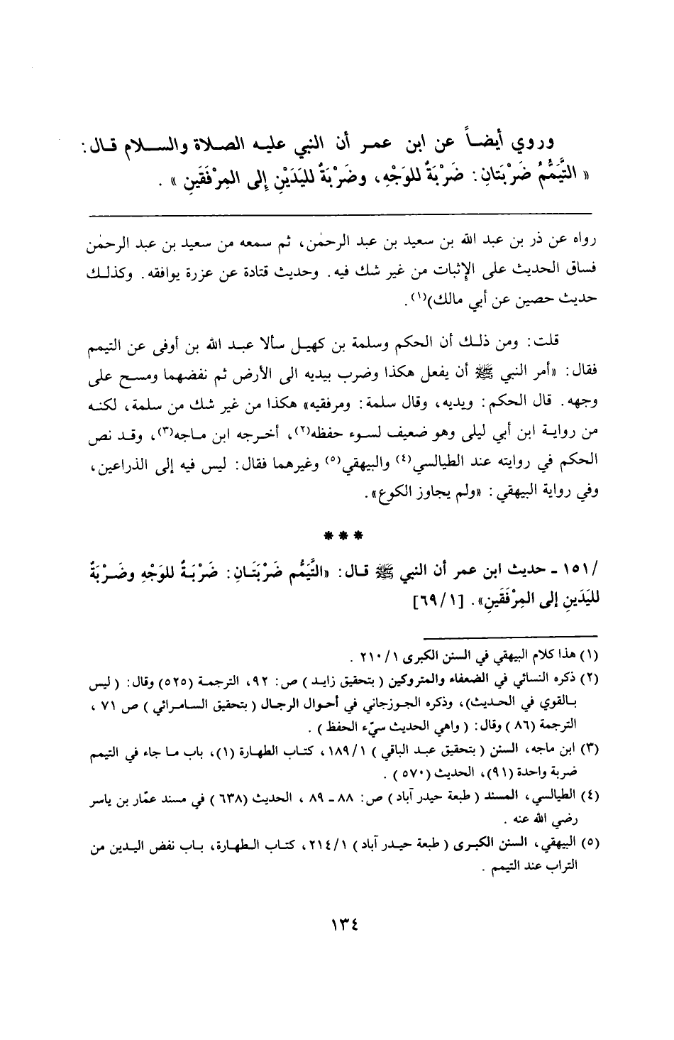 151 - حديث ابن عمر أن النبي - صلى الله عليه وسلم - قال: "التَّيَمُّم ضَرْبَتَانِ: ضَرْبَةٌ للوَجْهِ وضَرْبَةٌ لليَدَينِ إلى المِرْفَقَينِ".