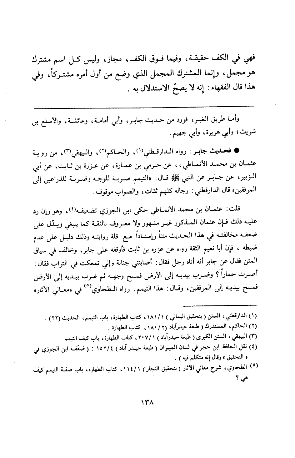 • فحديث جابر: رواه الدارقطني، والحاكم، والبيهقي، من رواية عثمان بن محمد الأنماطي،، عن حرمي بن عمارة، عن عزرة بن ثابت، عن أبي الزبير، عن جابر عن النبي - صلى الله عليه وسلم - قال: "التيمم ضربة للوجه وضربة للذراعين إلى المرفقين" قال الدارقطني: رجاله كلهم ثقات، والصواب موقوف.