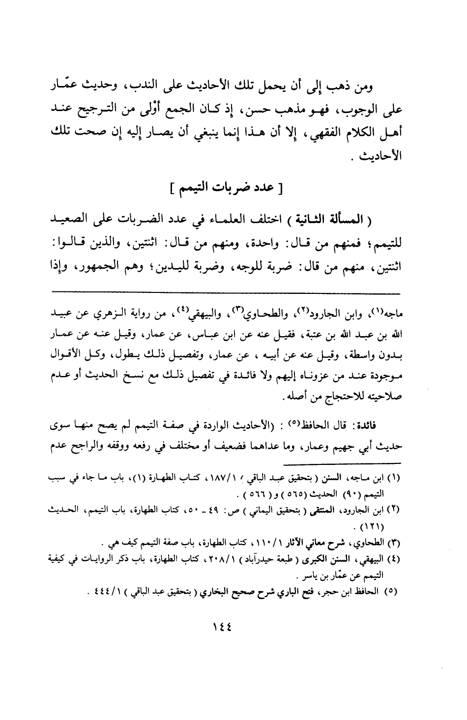 فائدة: قال الحافظ: (الأحاديث الواردة في صفة التيمم لم يصح منها سوى حديث أبي جهيم وعمار، وما عداهما فضعيف أو مختلف في رفعه ووقفه والراجح عدم