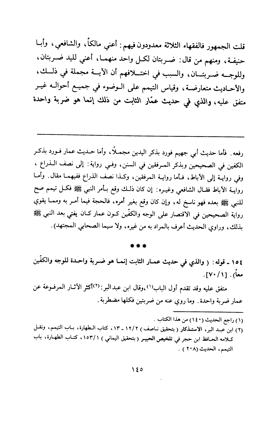 154 - قوله: (والذي في حديث عمار الثابت إنما هو ضربة واحدة للوجه والكفين معًا).