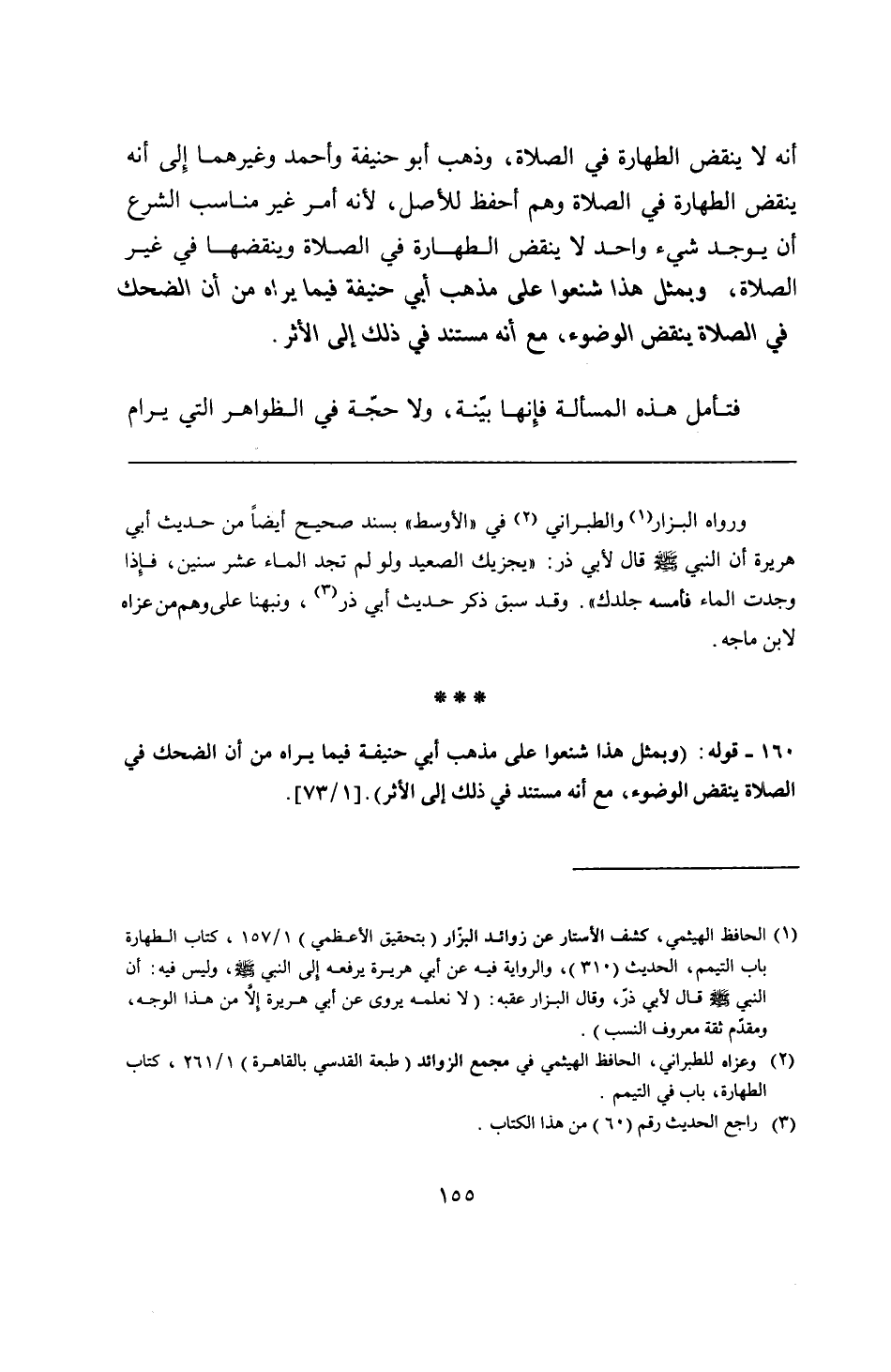 160 - قوله: (وبمثل هذا شنعوا على مذهب أبي حنيفة فيما يراه من أن الضحك في الصلاة ينقض الوضوء، مع أنه مستند في ذلك إلى الأثر).