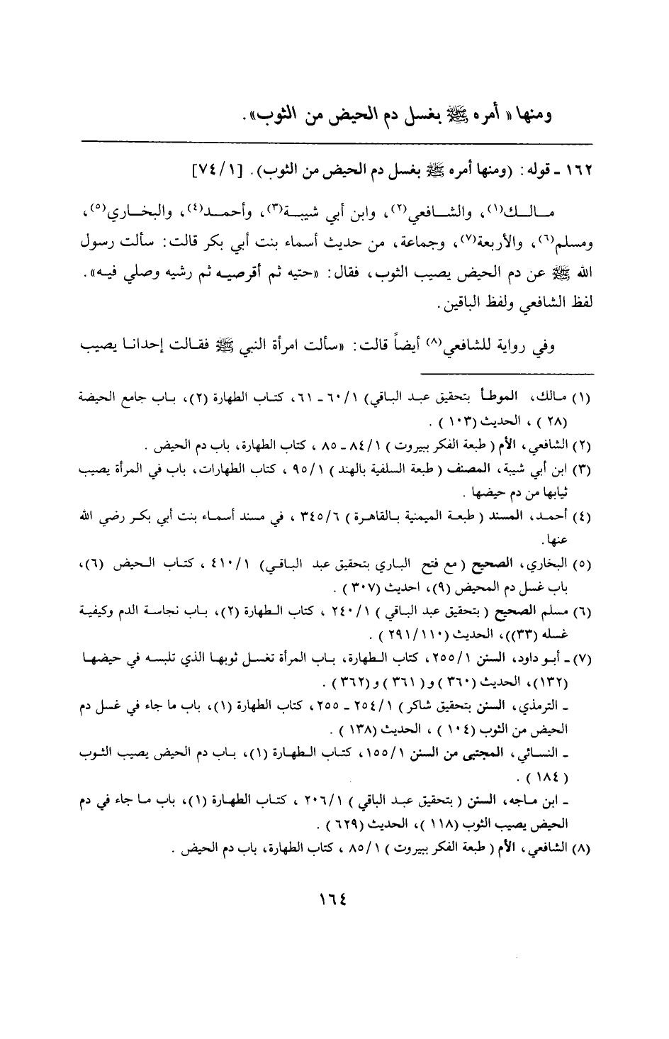 مالك، والشافعي، وابن أبي شيبة، وأحمد، والبخاري، ومسلم، والأربعة، وجماعة، من حديث أسماء بنت أبي بكر قالت: سألت رسول الله - صلى الله عليه وسلم - عن دم الحيض يصيب الثوب، فقال: "حتيه ثم أقرصيه ثم رشيه وصلي فيه". لفظ الشافعي ولفظ الباقين.