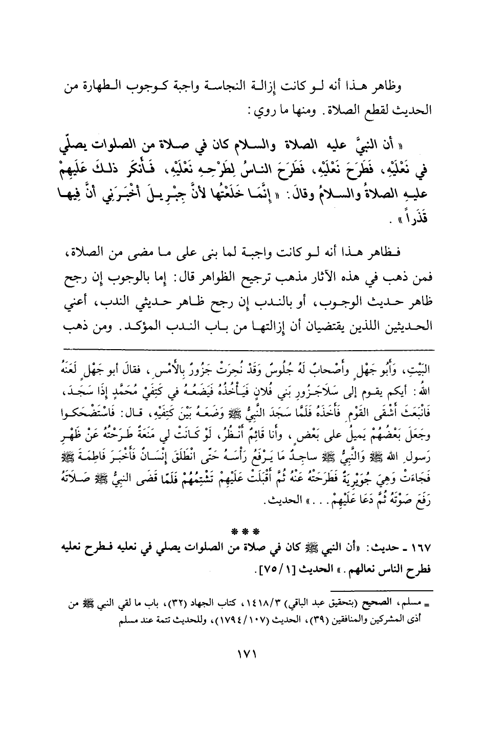 167 - حديث: "أن النبي - صلى الله عليه وسلم - كان في صلاة من الصلوات يصلي في نعليه فطرح نعليه فطرح الناس نعالهم" الحديث.