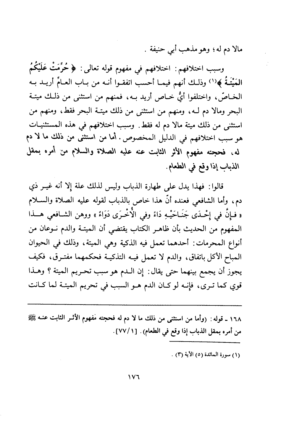 168 - قوله: (وأما من استثنى من ذلك ما لا دم له فحجته مفهوم الأثر الثابت عنه - صلى الله عليه وسلم - من أمره بمقل الذباب إذا وقع في الطعام).