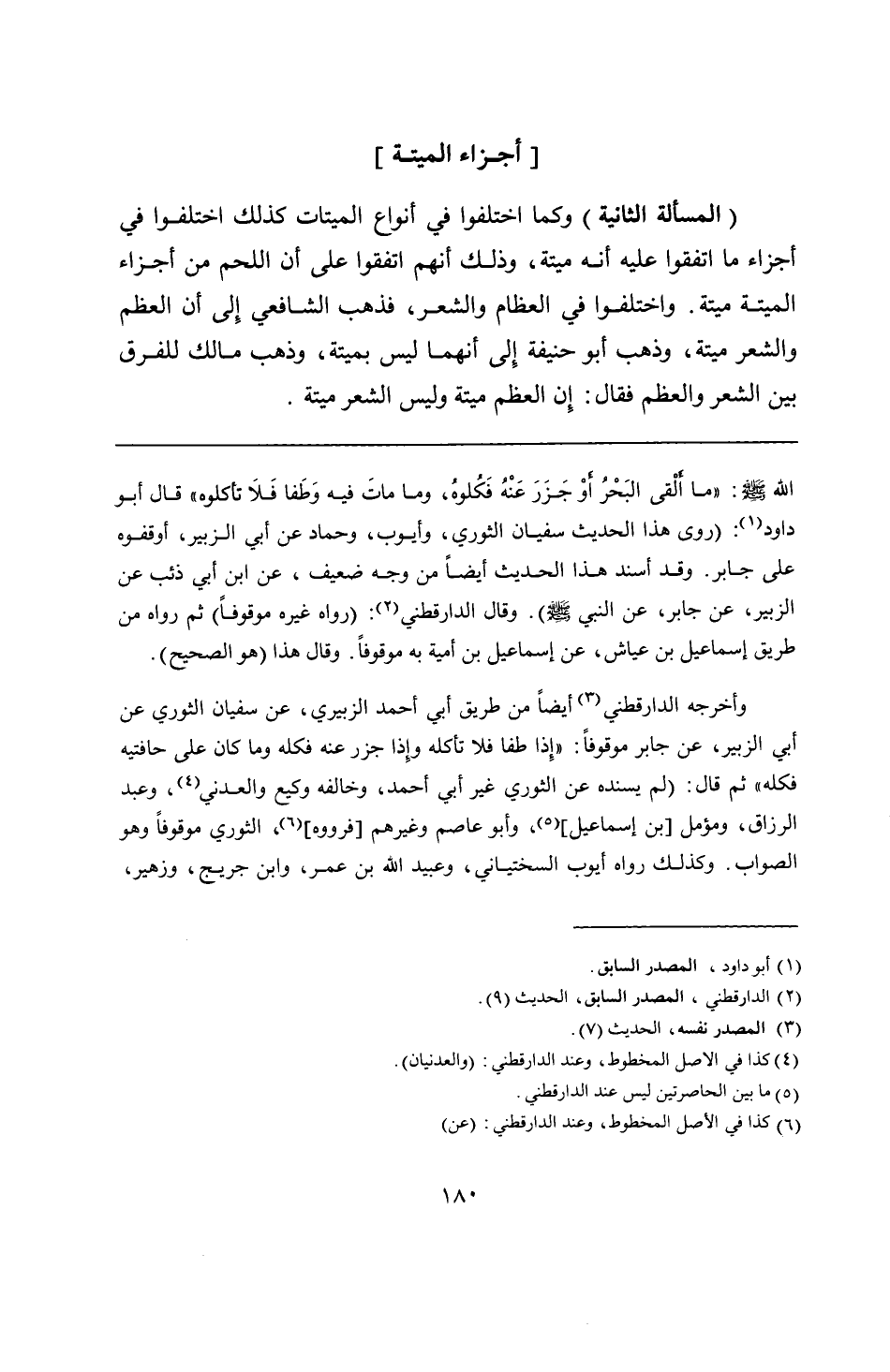 وأخرجه الدارقطني أيضًا من طريق أبي أحمد الزبيري، عن سفيان الثوري عن أبي الزبير، عن جابر موقوفًا: "إذا طفا فلا تأكله وإذا جزر عنه فكله وما كان على حافتيه فكله" ثم قال: (لم يسنده عن الثوري غير أبي أحمد، وخالفه وكيع والعدني، وعبد الرزاق، ومؤمل بن إسماعيل، وأبو عاصم وغيرهم فرووه، الثوري موقوفًا وهو الصواب. وكذلك رواه أيوب السختياني، وعبيد الله بن عمر، وابن جريج، وزهير،